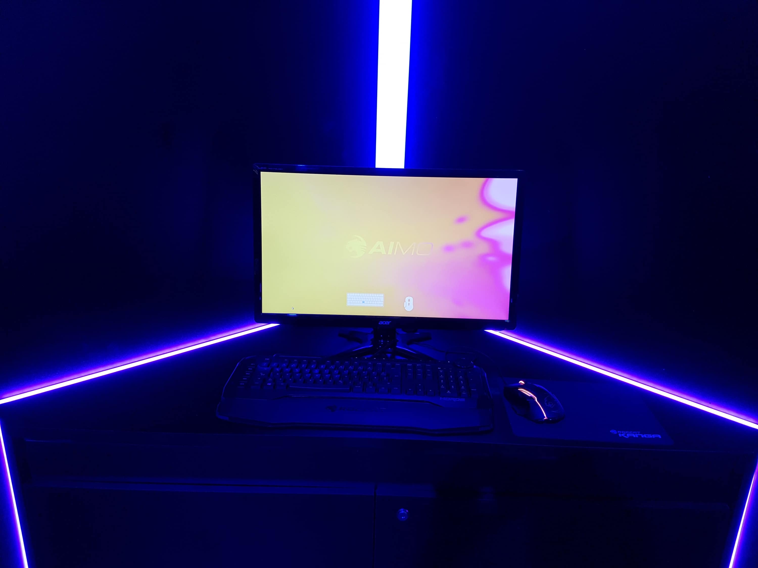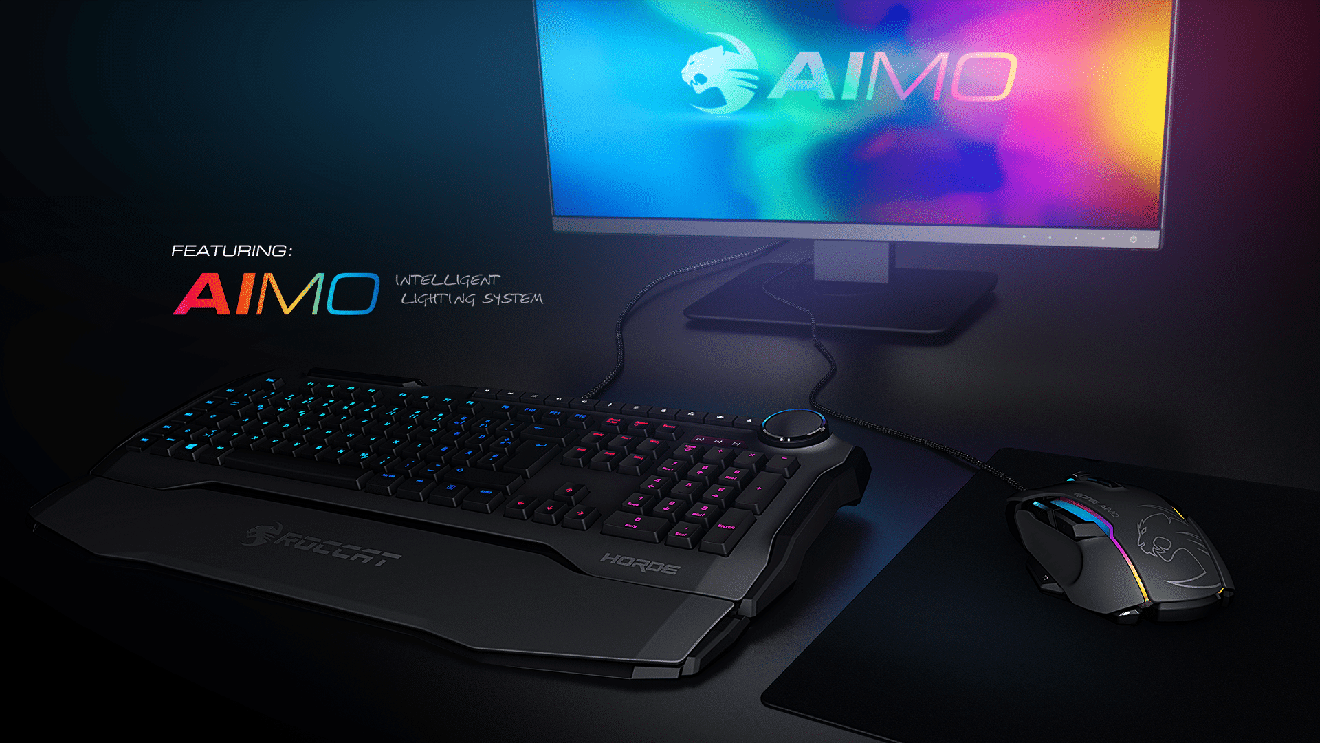 Wenn man an Roccat denkt, dann hat man sofort eine typische RGB-Beleuchtung vor Augen. Ob breathing lights, buntes Schimmern, Pulsieren oder andere Farbverläufe… Roccat stand bei Zockern immer für entsprechendes Design und Beleuchtung. Die neueste Entwicklung ist das Beleuchtungssystem AIMO, welches intelligenter sein und mehr können soll als Vorgänger wie Alien-FX. Ein Bildschirmschoner reagiert auf Bewegungen der Maus und auf den gezeigten Produkten herrscht eine bunte Lichtharmonie, die sich intelligent zwischen allen Geräten (Maus, Tastatur, Monitor und bald auch auf einem Headset) abstimmt. Es bleibt abzuwarten, wie sich das Ganze genau mit der Software einstellen lässt.