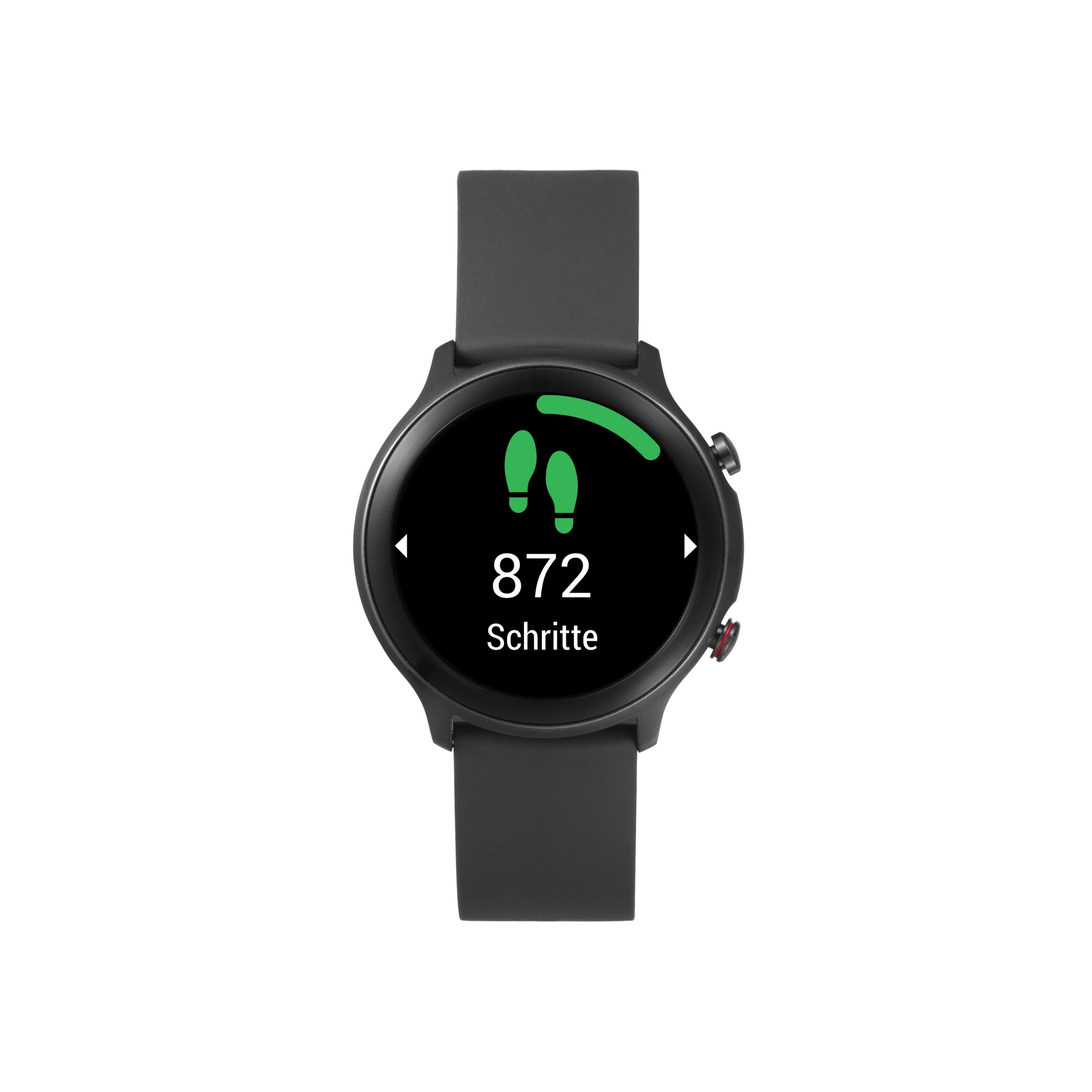 Zudem soll die Doro Watch besonders leicht zu bedienen sein. Neben dem Touchscreen erfolgen Eingaben über zwei zusätzliche Knöpfe. Mit dem oberen gelangst du ins Menü, wo du nach links und rechts wischen kannst, um darin zu navigieren.
