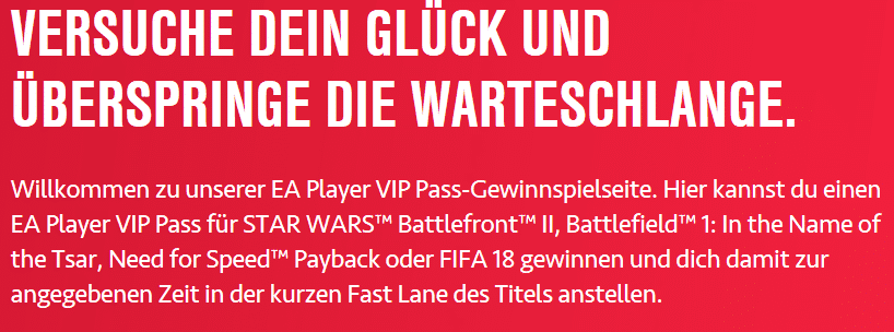 Mit diesen VIP Pässen müsst ihr nicht anstehe und bekommt direkt Zutritt zu der sogenannten Fast Lane. EA verlost dafür für die Spiele Star Wars Battlefront 2, Battlefield 1 In the Name of the Tsar, Need for Speed: Payback und Fifa 18 solche Pässe.