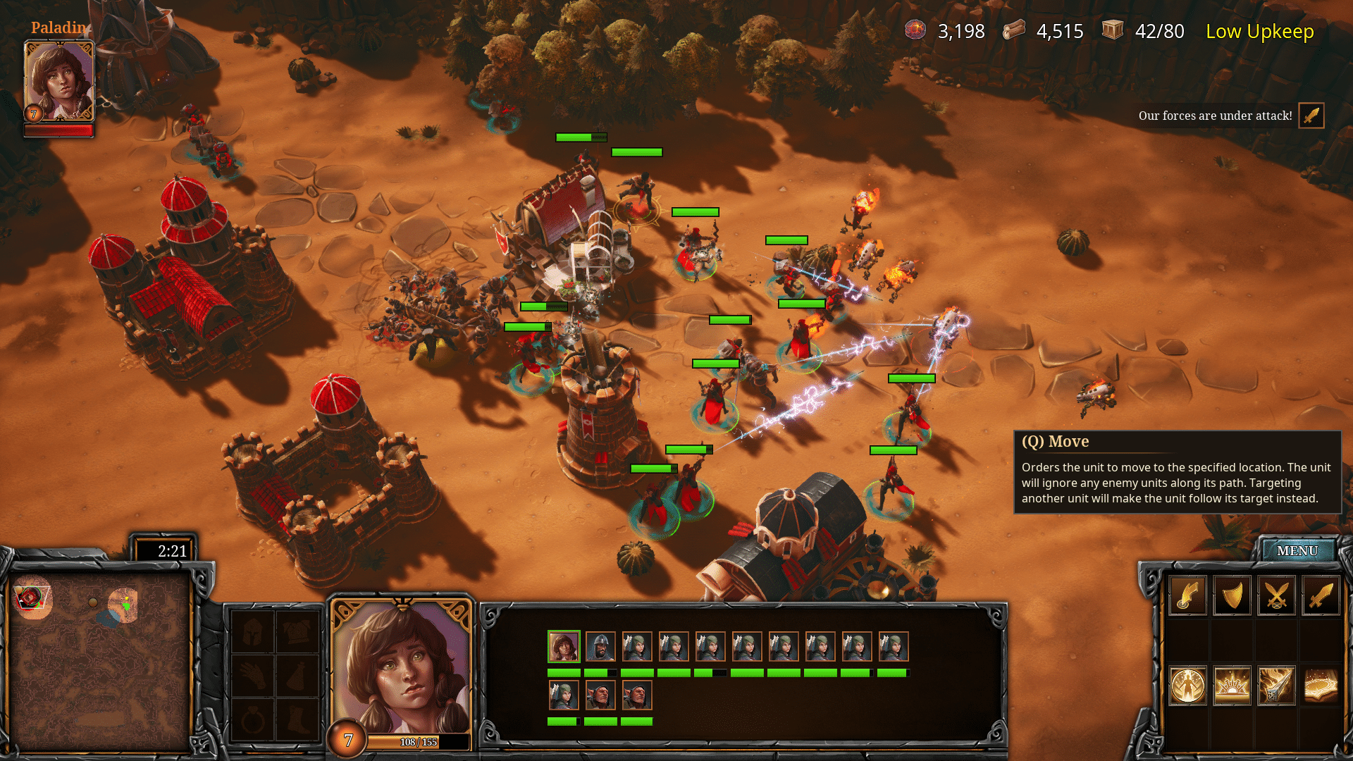Das Gameplay im Skirmish Modus ist dem klassischen RTS nachempfunden und spielt sich auch genau so. Ihr befehligt eure Arbeiter, sammelt Ressourcen, errichtet Gebäude, rekrutiert Einheiten und verbessert diese durch Forschung. Eine besondere Rolle nimmt euer Held ein. Jede der drei Fraktionen hat einen eigenen Helden. Der ist als Einheit merklich stärker als reguläre Einheiten und kann zudem durch Skillpunkte gelevelt werden. So könnt ihr euren Helden in Richtung Tank, DPS oder als Supporter für eure Truppen gestalten. Neben dem feindlichen Team tummeln sich auf der Map außerdem einige Minibosse und ein großer Bossgegner, der euch ohne ausführliche Vorbereitungen, das Leben schwer macht. Geratet ihr in Bedrängnis oder plant einen Angriff könnt ihr für euren Verbündeten den Ort des Geschehens auf der Map markieren. Neben den Kampagnen soll es außerdem einen online Multiplayer geben. Die verschiedenen Spielmodi können wahlweise mit echten Mitspielern oder auch allein mit und gegen die KI gespielt werden.