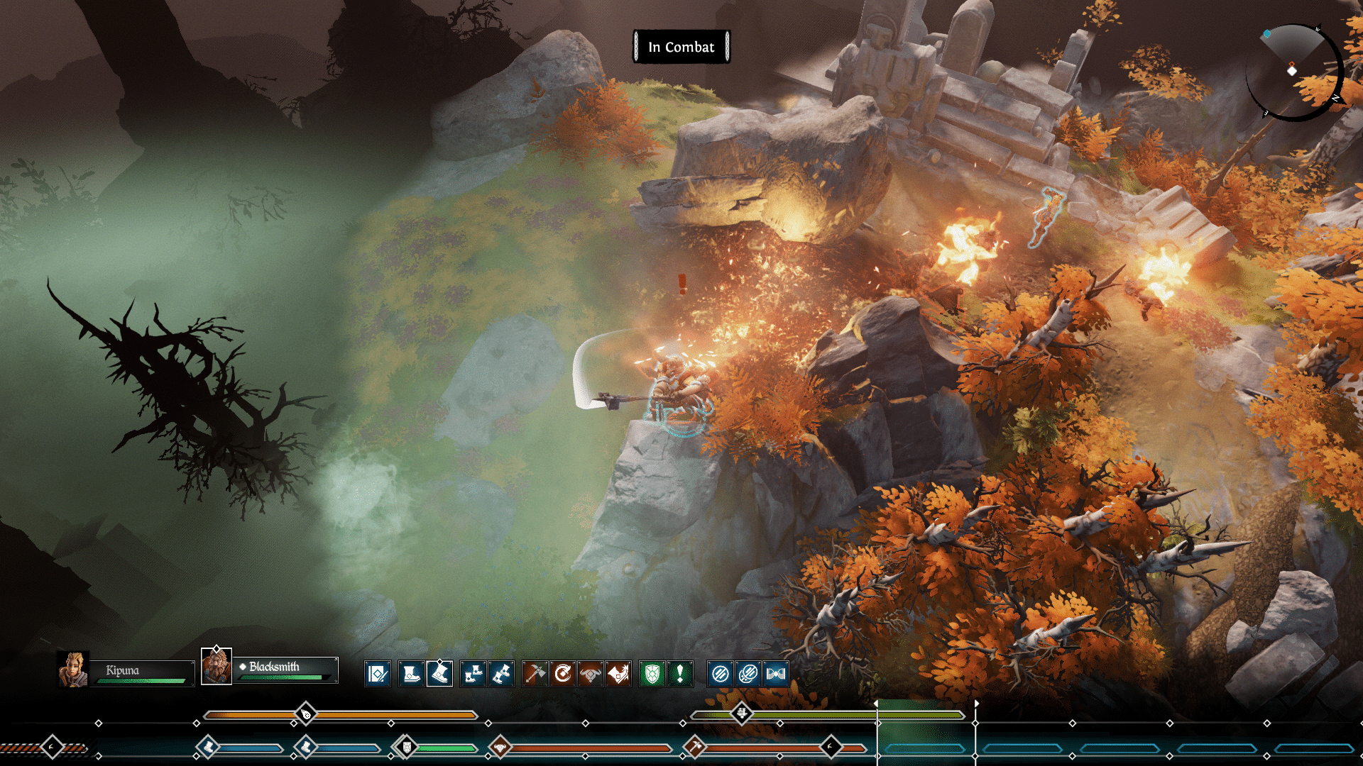 Diese Fähigkeit ist das Kernelement in Iron Danger. Kipuna kann die Zeit um 5 Sekunden vor oder zurück bewegen. Dabei gibt es für sie und ihren Begleiter separate Zeitlinien. Das heißt ihr könnt beispielsweise die Zukunft von Kipuna ändern, ohne die Zeitlinie des Begleiters zu verändern. Das eröffnet sehr viele Möglichkeiten um verschiedene Situationen zu lösen. Ihr lauf einen Weg entlang, ein großer Gegner entdeckt euch und greift an. Ihr spult zurück, wisst jetzt, dass der Gegner da ist, also geht ihr einen anderen Weg und konstruiert vielleicht eine Falle. Bei der Falle habt ihr dann auch wieder verschiedene Möglichkeiten, beispielsweise ist eine Kombination aus explosiven Fässern und einem umstürzenden Baum möglich. Der Zeitstrahl auf dem ihr euch bewegt ist in Segmente der einzelnen Aktionen unterteilt. Das heißt ihr müsst nicht auf die Zehntelsekunde genau suchen, wo ihr was ändern wollt, sondern könnt einfach direkt zu der Aktion zurückspringen, die ihr ändern möchtet.