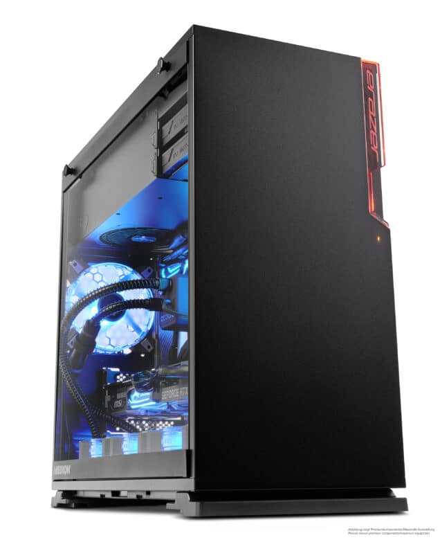 Zum neuen „Aldi-Lineup“ gehört aber auch ein (nach MEDIONs Angaben) „absoluter High-End Gaming-PC“. Der Hunter X10 kommt mit einem Intel Core i9-10900K sowie einer ZOTAC Nvidia GeForce RTX 2080 Super Grafik daher. Dies soll bei aktuellen Games nicht nur butterweiches, sondern auch hochauflösendes Zocken in 4K möglich machen. Es ist erstaunlich, dass MEDION selbst in seinem Top-Modell nicht auf eine stärkere GPU der 3000er Serie setzt. So hätte man durchaus mit einer GeForce RTX 3070 rechnen können. CPU und GPU stehen 32 GB RAM sowie eine 1 Terabyte große PCIe-SSD zur Seite. Für ausreichend Speicherplatz soll dank einer zusätzlichen 1 Terabyte großen HDD gesorgt sein.