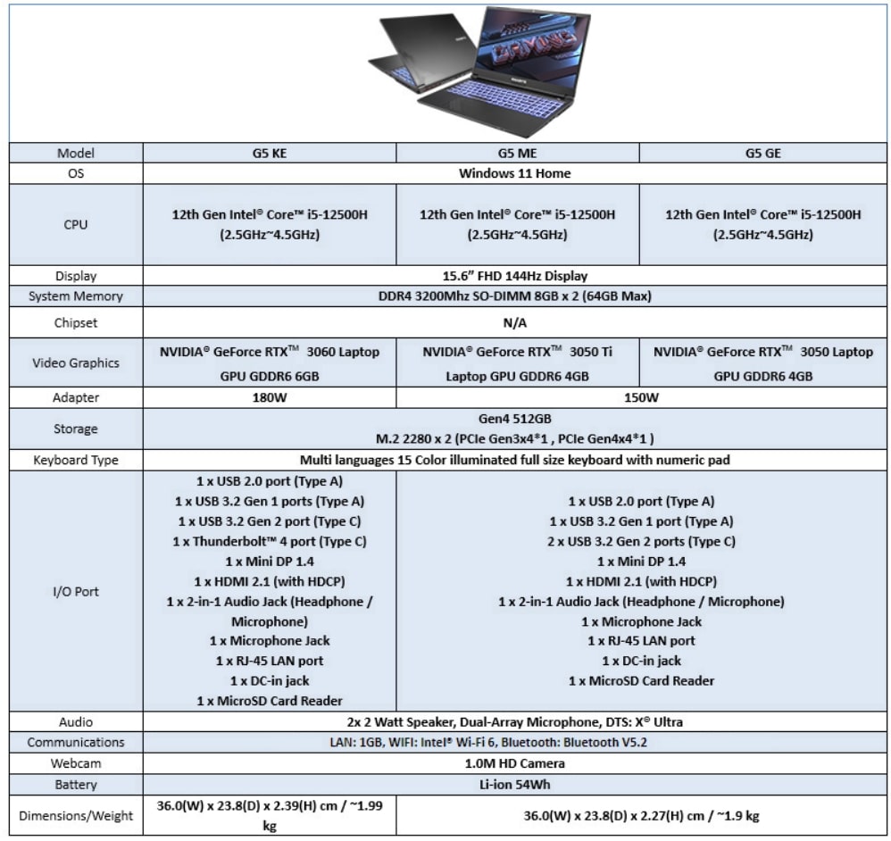 Beiden Notebooks gemein ist ein 64 Wh großer Lithium-Ionen-Akku, zu denen Gigabyte keine Angaben bezüglich der Laufzeiten macht. Zur weiteren Ausstattung gehören Gigabit-LA, Wi-Fi 6 und Bluetooth 5.2. Verbaut sind zudem zwei 2-Watt-Stereolautsprecher, die zudem DTS:X Ultra Audio unterstützen, sowie ein Mikrofon und eine 1 MP HD-Webcam.