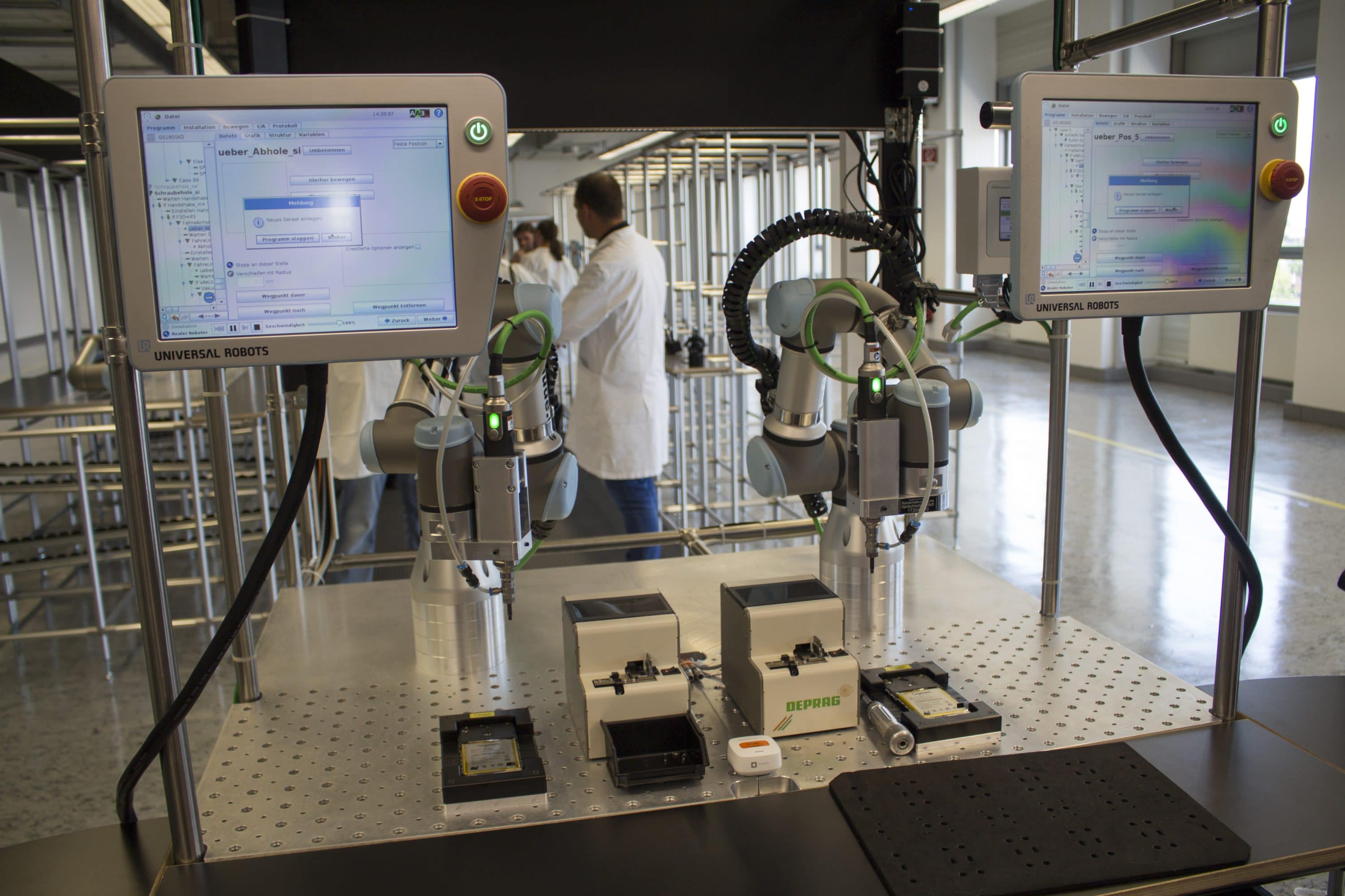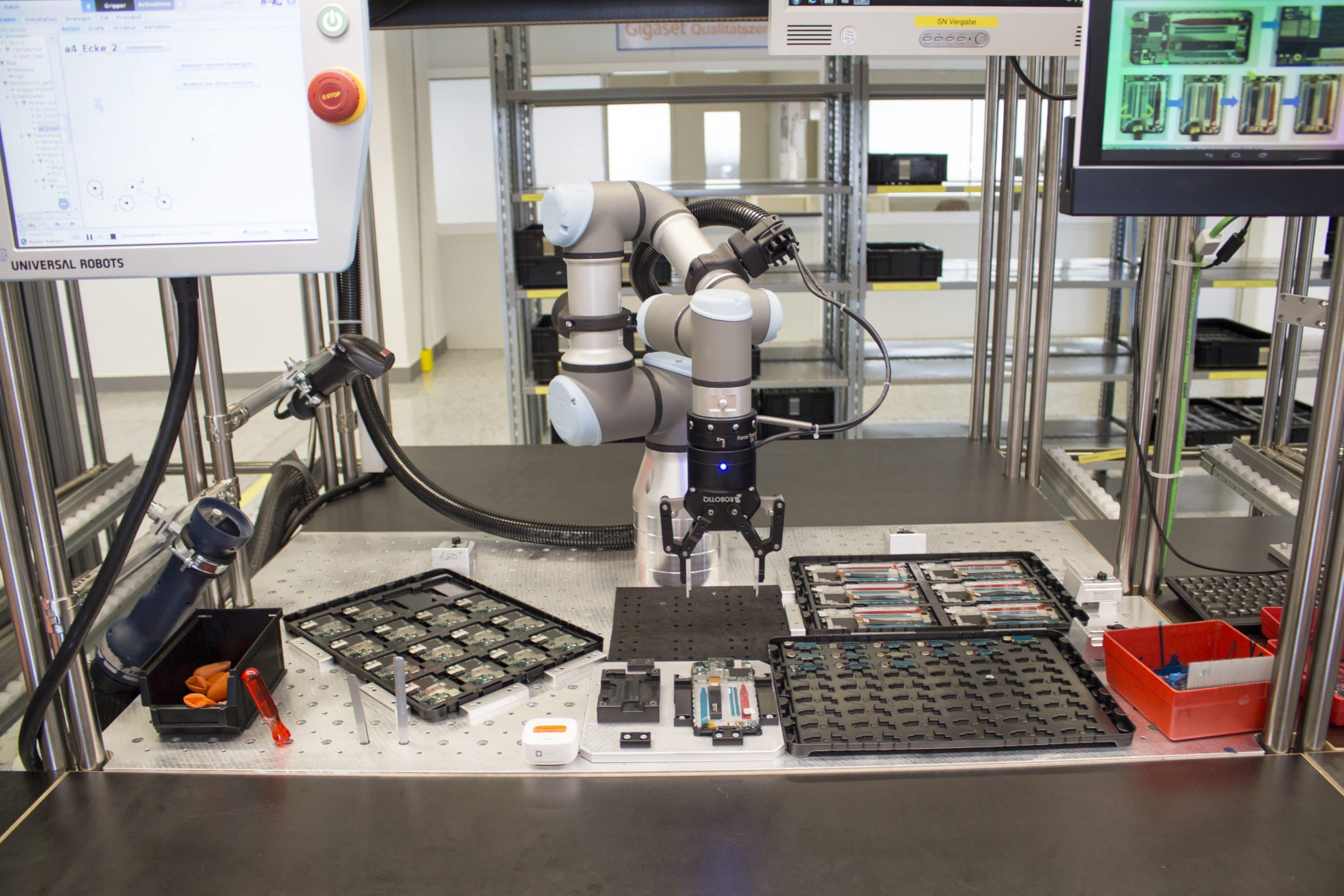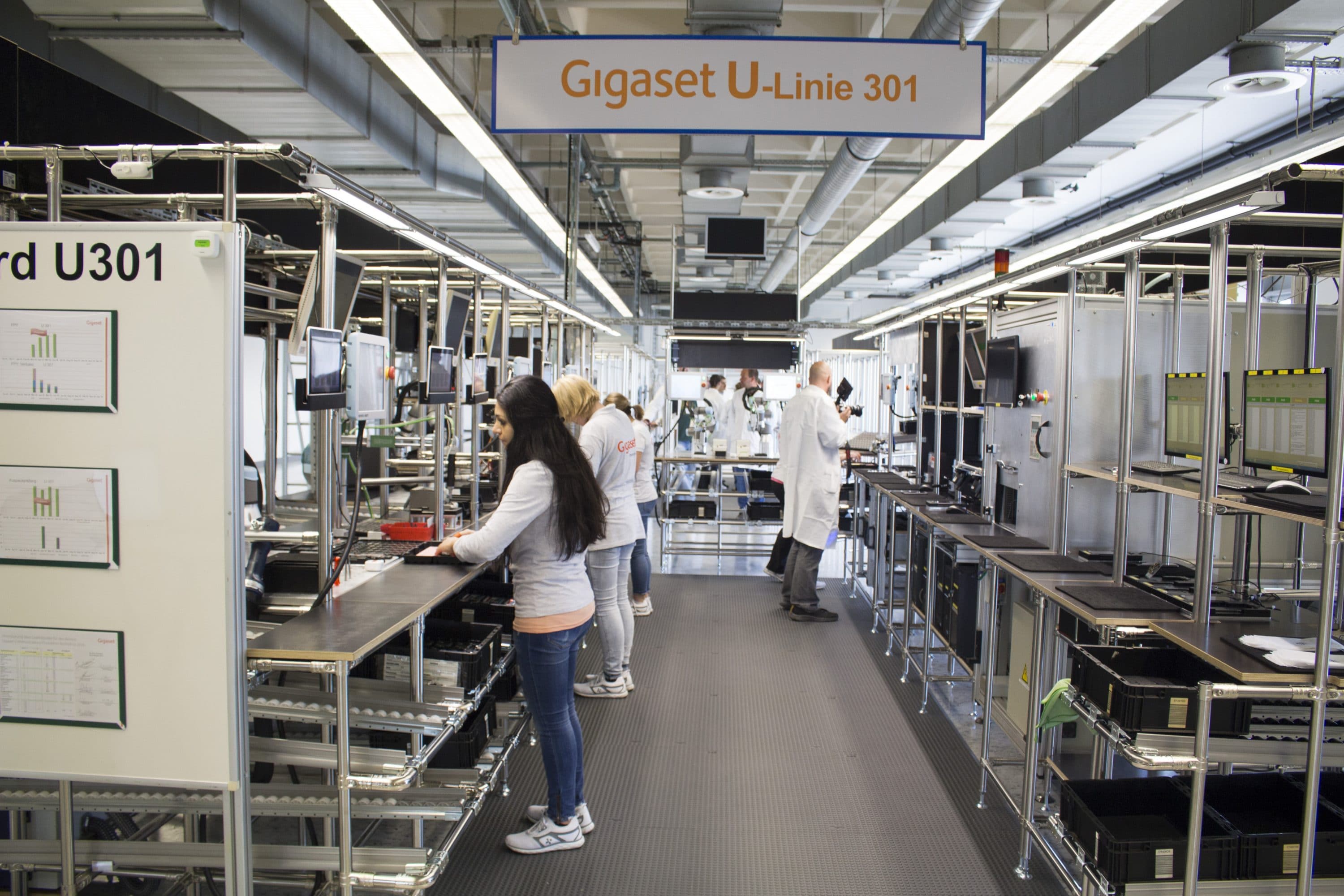 Die Mitarbeiter durchlaufen in der U-Linie 301 die komplette Montage des 179 Euro günstigen Smartphones. So steht die Produktion bei einem Mitarbeiterausfall nicht vollständig still. Die Mitarbeiter arbeiten zusammen mit intelligenten Roboter-Armen der Firma Universal Robotics. So kann Gigaset eine gleichbleibende Qualität garantieren. 40 Prozent der Fertigung geschieht in Handarbeit, 60 Prozent durch Robotik. Besonders stolz ist Gigaset auf seine Qualitätssicherung, denn jedes Smartphone wird intensiv geprüft. Auch der Service und die Reparatur findet vor Ort statt.