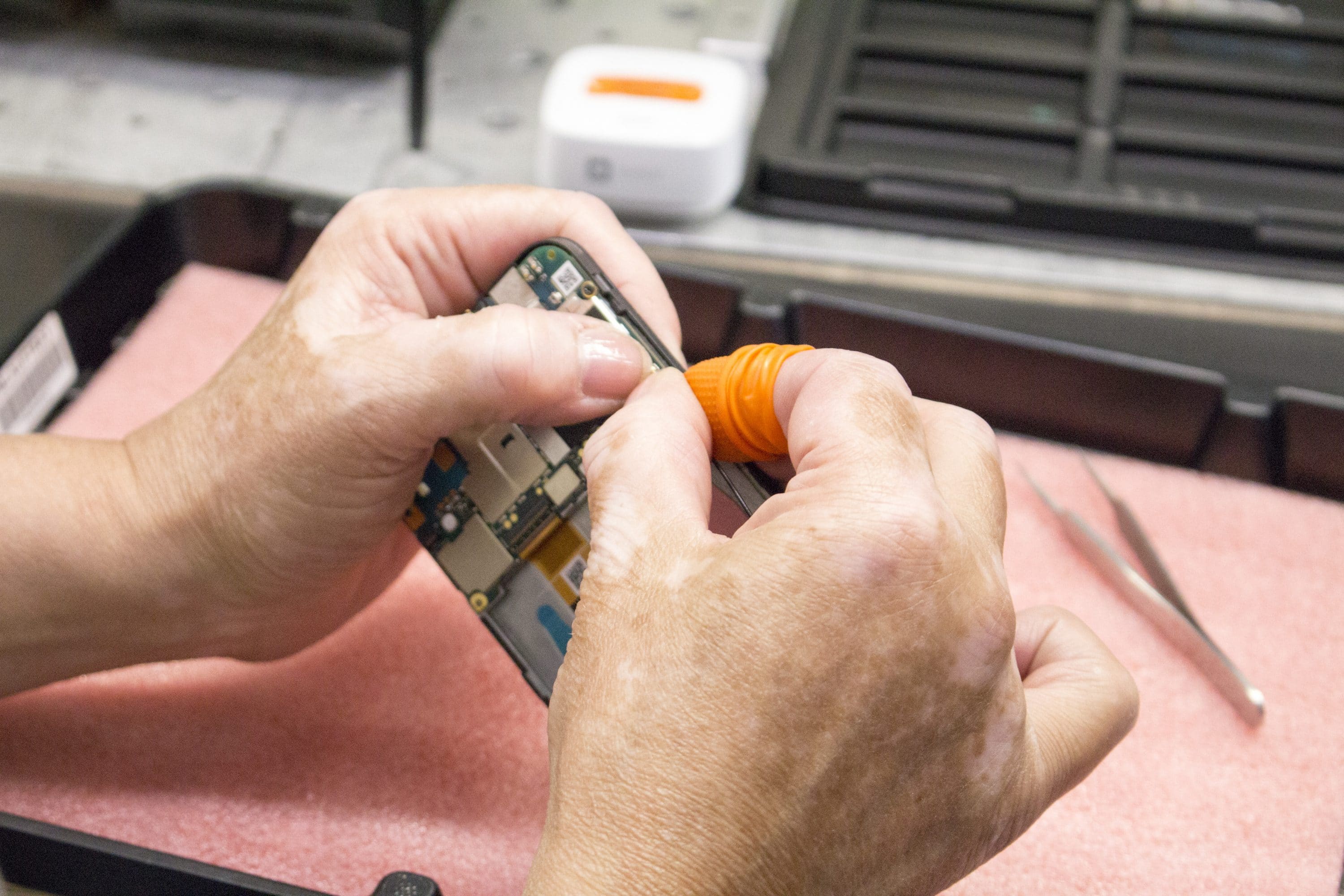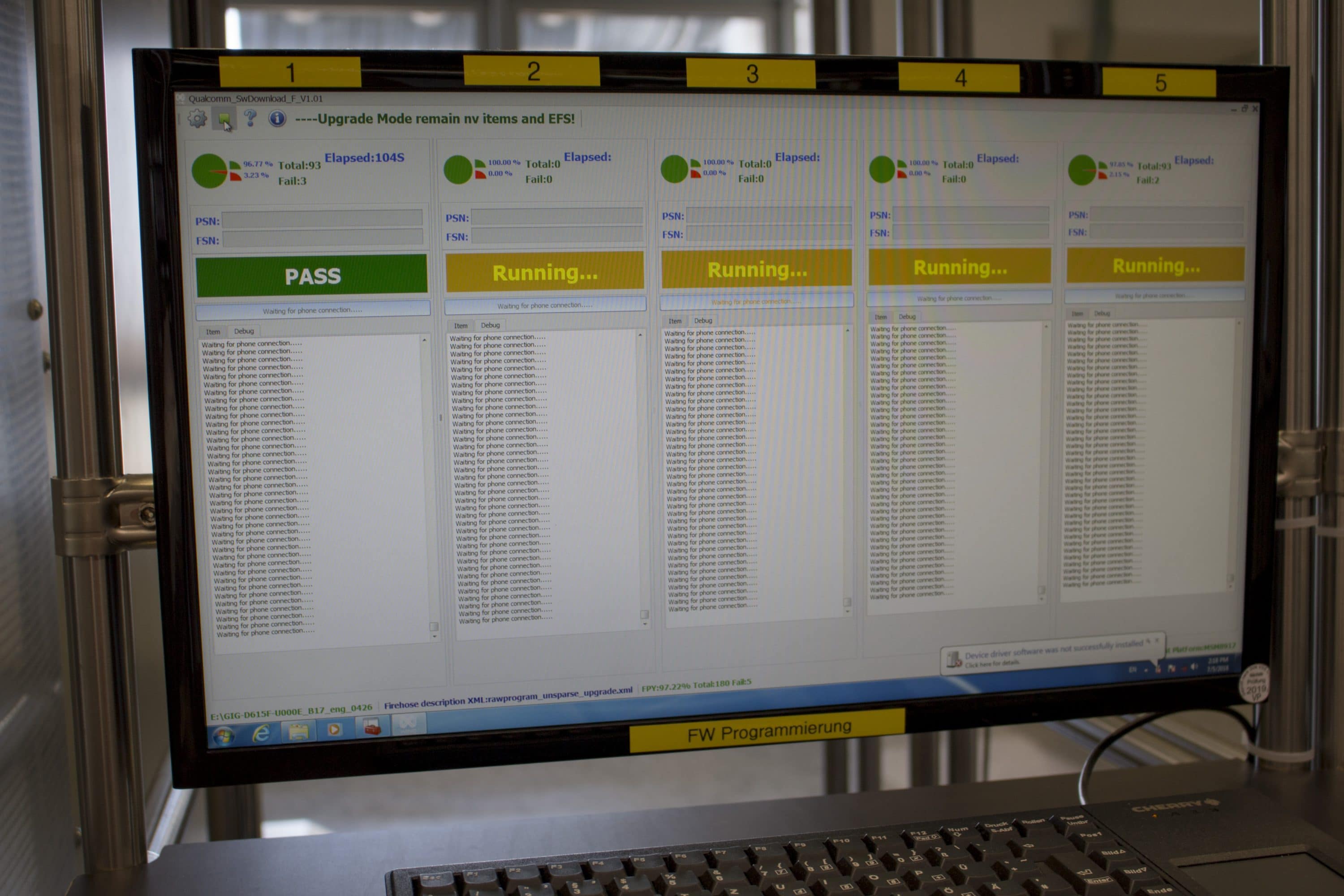 Derzeit gibt es erst eine Fertigungslinie mit acht Mitarbeitern, die jede Woche etwa 2.000 Smartphones fertigen. Die Produktion kann jedoch stark gesteigert werden. In drei Schichten wären es schon 6.000 Smartphones. Und die 2.500 Quadrameter große Halle bietet Platz für weitere fünf sogenannte U-Linien – erst ein Drittel der Fläche ist belegt. Sollte die Nachfrage steigen, ist Gigaset also gerüstet.