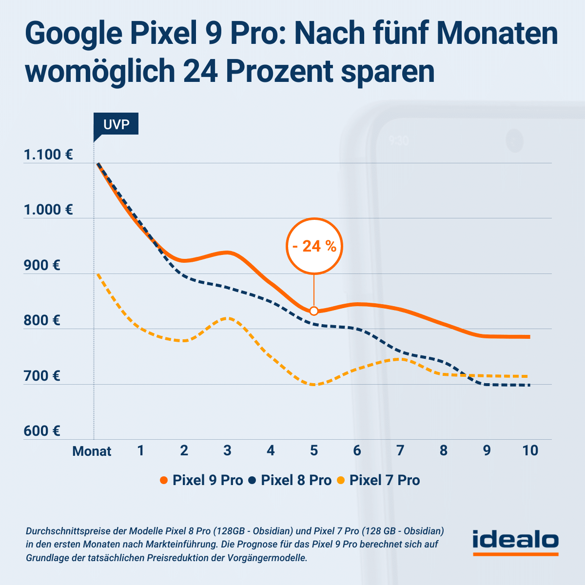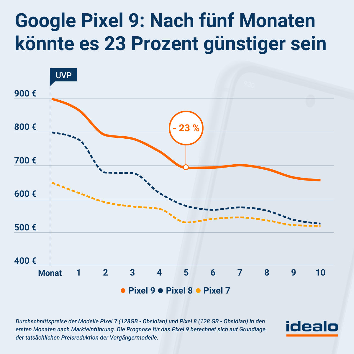 So geht man auf Basis der Preisentwicklung der Vorjahresmodelle Pixel 8 und 8 Pro sowie Pixel 7 und 7 Pro davon aus, dass der Preis des Pixel 9 und Pixel 9 Pro bereits in den ersten Monaten nach Veröffentlichung rapide sinken dürfte. 5 Monate nach Release dürfte laut der Prognose der beste Kaufzeitpunkt sein.
