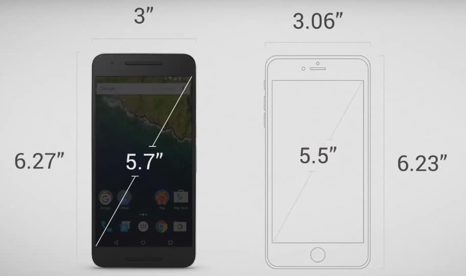 Dave Burke, VP Engineering, stellte auf der Bühne zuerst das Nexus 6P vor. Es ist das erste Nexus Phone, das komplett aus Metall besteht. Für das Cover wurde Aluminium verwendet und die Kanten wurden für eine perfekte Optik mit Diamanten geschliffen. Mit nur 7,3 mm Dicke ist es dünner als die Vorgängermodelle. Ein 64-bit Prozessor der neusten Generation (Qualcomm Snapdragon 810 v2.1 Octa-Core) treibt das neue Google Smartphone an. Das Display bietet mit 5,7 Zoll viel Platz, soll laut eigenen Aussagen immernoch gut in der Hand liegen. Für die Stromversorgung sorgt ein Akku, der 50 Prozent mehr Power hat als der beim iPhone 6. Zum Aufladen kann das Nexus 6P über einen USB C-Port angeschlossen werden.