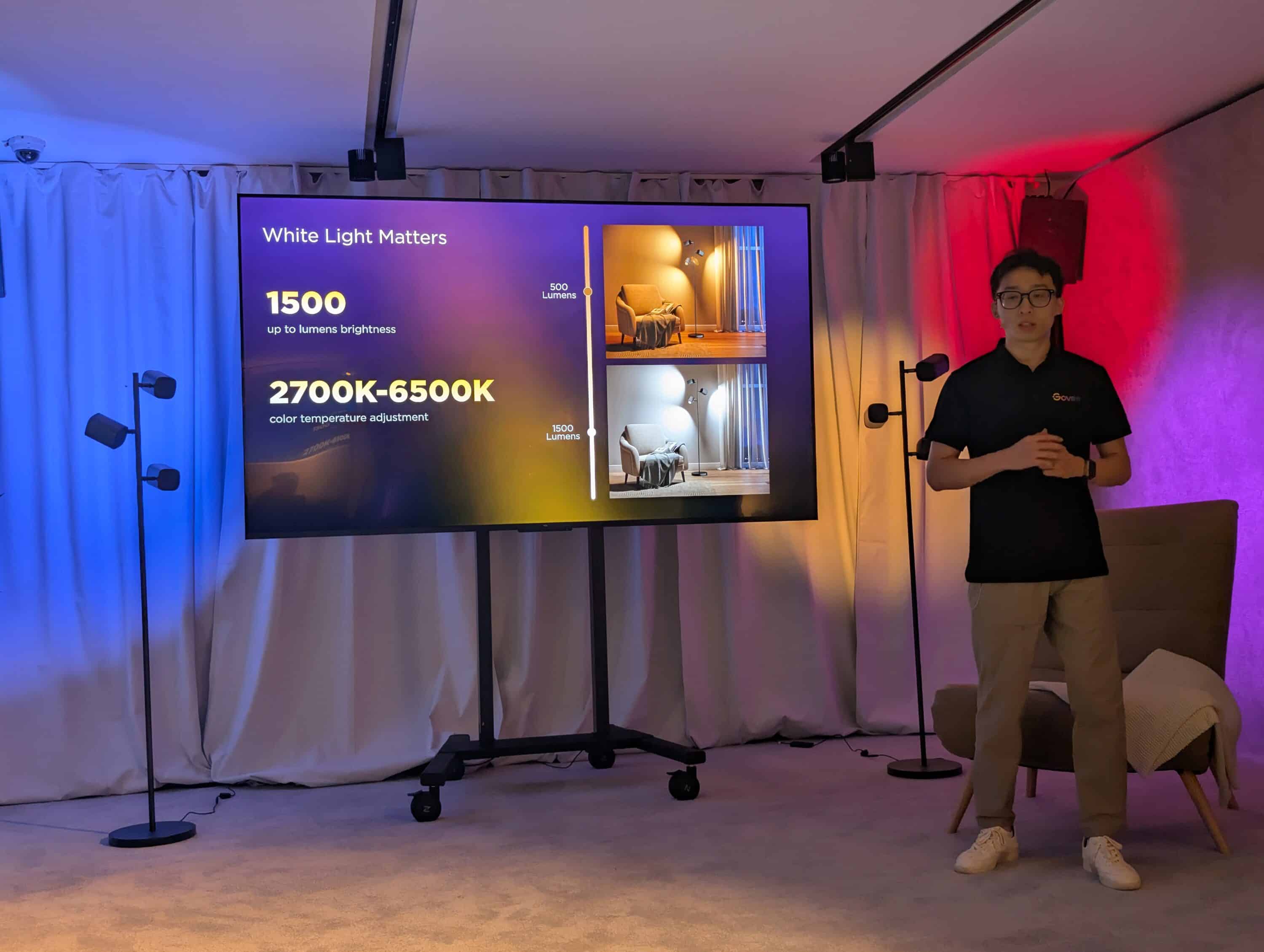 Neben dem Flaggschiffmodell erweitern zwei weitere Modelle die neue Produktgeneration: Die Govee Uplighter Floor Lamp bietet eine vertikale Lichtinszenierung mit drei Lichtzonen. Der obere Lichtbereich erzeugt eine indirekte Deckenbeleuchtung mit dynamischen Wellenmustern, während der mittlere Abschnitt für dekorative RGBIC-Effekte sorgt. Der untere Teil liefert 1000 Lumen helles, funktionales Licht – etwa für den Arbeitsplatz oder den Flur. Eine Tageslichtautomatik passt die Lichtintensität je nach Umgebungshelligkeit automatisch an.
