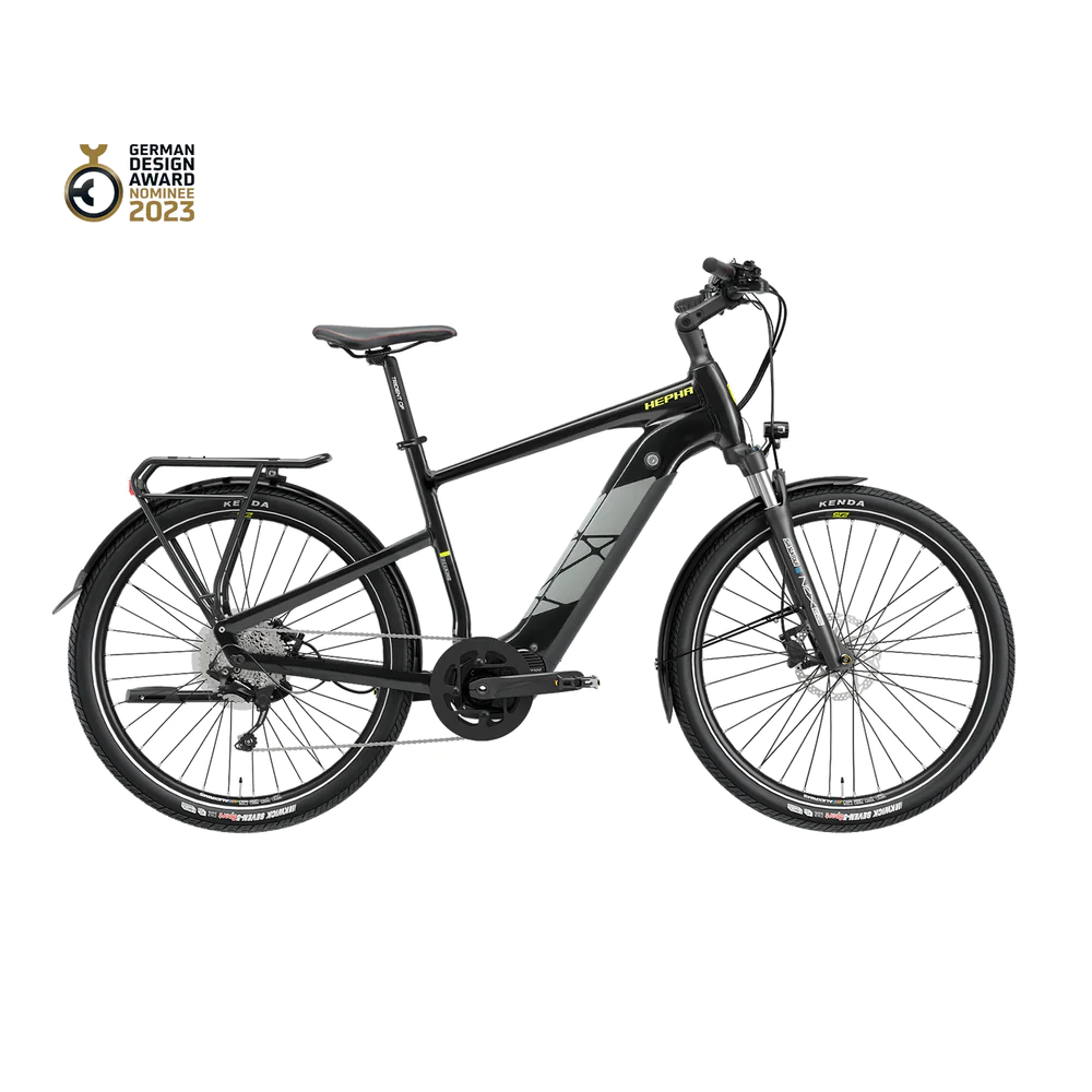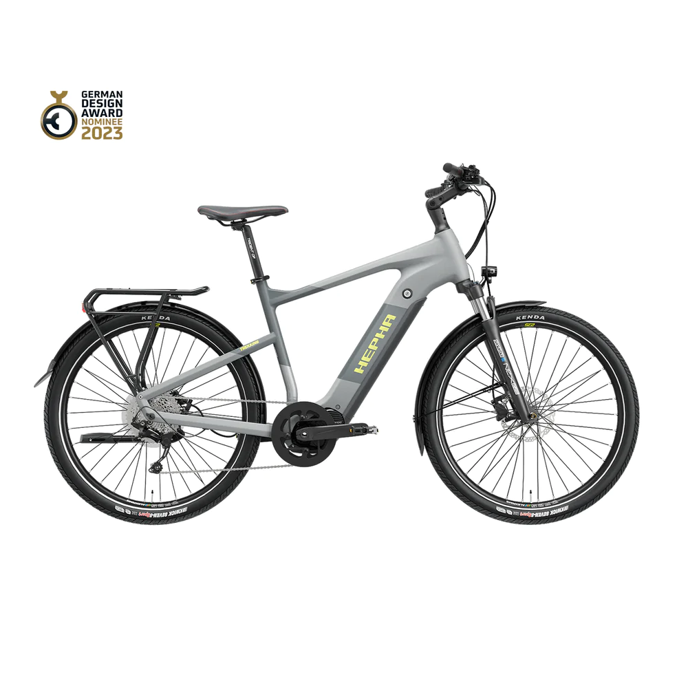 Das Hepha Trekking 7 des deutschen Herstellers kommt wahlweise als Long Rang- oder als Performance-Variante daher. Beiden Modellen gemein ist ein 708 Wh starker Akku, der eine Reichweite von bis zu 200 Kilometern ermöglichen soll. Der Akku ist dabei unsichtbar im Unterrohr des E-Bikes integriert.