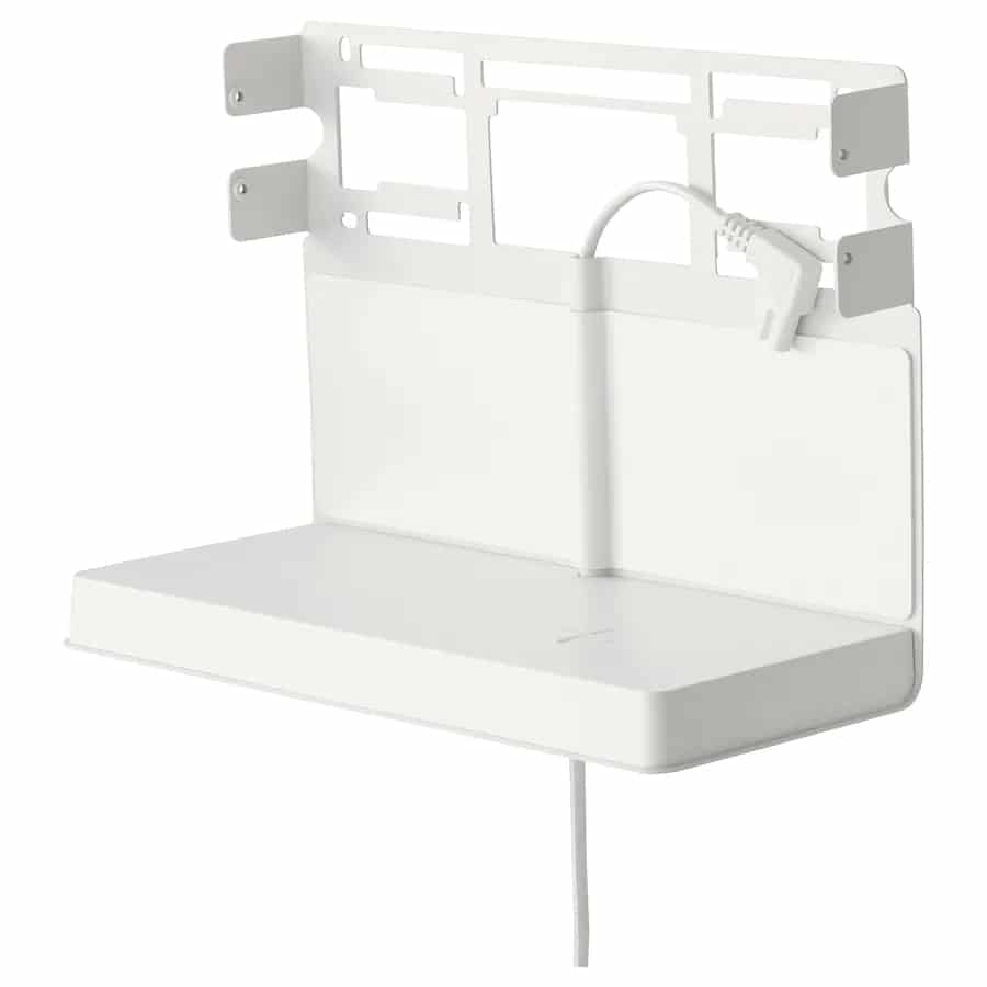 Sie erlaubt das Aufladen von Smartphones und anderer QI-fähiger Geräte und zwar kabellos. Möglich macht das ein Stromanschluss, der von der Rückseite des Regals aus mit einer Steckdose verbunden werden möchte. Zusätzlich steht an der linken Seite ein USB-C-Anschluss zur Verfügung, an dem ebenfalls geladen werden kann. Maximal mit einer Geschwindigkeit von 18 Watt. Der USB C-Port ist kompatibel mit dem Standard Power Delivery 3.0.