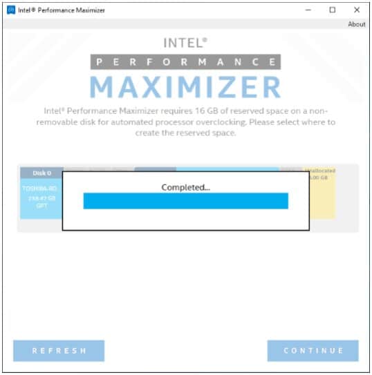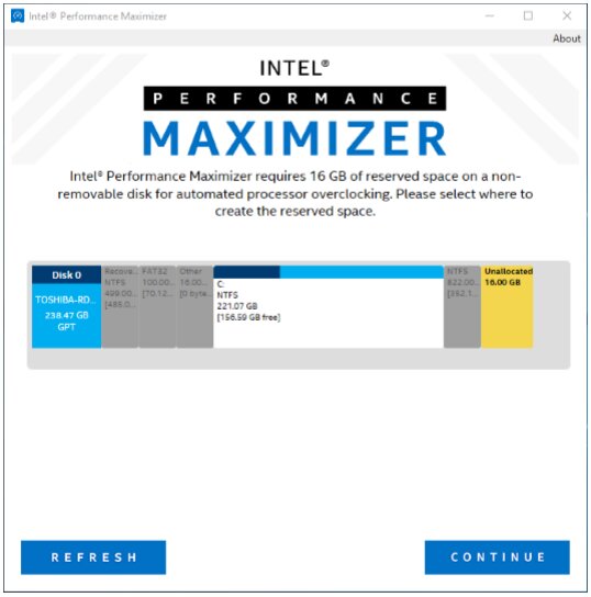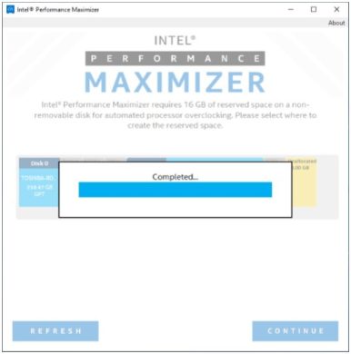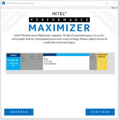 Bevor die maximale Taktfrequenz ermittelt werden kann, erstellt der Performance Maximizer während der Installation eine 16 Gigabyte große Partition, die exklusiv für das Tool reserviert wird.