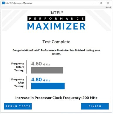 Laut Intel ist es normal, dass während des Übertaktungsvorgangs das System mehrmals abstürzen kann. Danach soll das Tool seine Arbeit aber automatisch fortsetzen, bis der maximal möglich Takt ermittelt wurde. Bei einer von Intel veröffentlichten Demo konnte der Turbotakt eines Core i5-9600K von 4,6 GHz auf 4,8 GHz gesteigert werden.