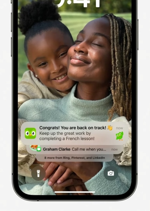 Ebenfalls neu auf dem Sperrbildschirm von iOS 16 ist die Darstellung von Benachrichtigungen. Diese werden fortan im unteren Drittel des Bildschirms dargestellt, um das Hintergrundbild und die Widgets nicht zu überdecken. Dabei werden Notifications zusätzlich gruppiert, während sich auf Wunsch auch Live-Benachrichtigungen anzeigen lassen.