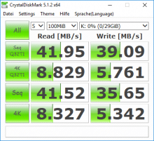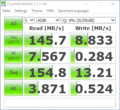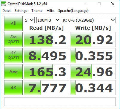 Wir haben unser Exemplar des datAshur PRO mit 32 GByte auch einem Benchmark-Test unterzogen. Als Vergleich diente einer der aktuell schnellsten USB-Sticks von Sandisk, dem Ultra Flair – zugegeben ein etwas unfairer Vergleich. Beide nutzen jedoch die USB-3.0-Schnittstelle. Angeschlossen waren beide an einem entsprechen Steckplatz am I/O-Panel unseres Gehäuses. Verwendet haben wir die aktuelle Version von Crystaldiskmark. Natürlich sind die von uns gemessenen Werte lediglich Vergleichswerte.