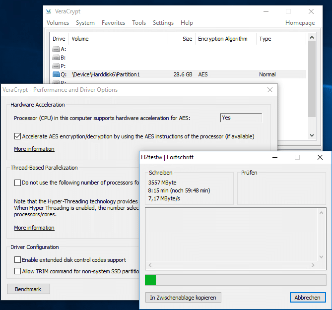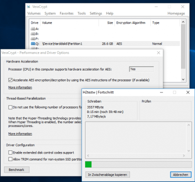 Einen letzten Vergleich zwischen dem Sandisk-Stick und dem datAshur PRO zogen wir dann, in dem wir mit der Verschlüsselungssoftware Veracrypt den Sandisk-Stick ebenfalls mit AES-XTS und 256 Bit verschlüsselten. Veracrypt nutzte auch das Hardwaremodul unseres flotten Ryzen 2700X von AMD. Und siehe da: Der datAshur PRO schlug den Sandisk Flair beim Schreiben plötzlich um Längen. Letztendlich stehen die Benchmarks aber weit unten in die Prioritätenliste eines solchen USB-Sticks, der sich vor allem bei der Funktionalität in puncto Sicherheit hervortut.