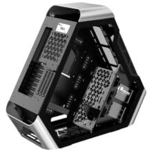 Trotz der dreieckigen Form bieten die TR03-Showcases jede Menge Platz. Allen voran besteht genug Raum, um ein ATX-Mainboard unterzubringen. Außerdem hat man die Wahl zwischen einer horizontalen oder vertikalen Anbringung einer maximal 460 mm langen Grafikkarte. Eine stabilisierende Halterung für diese ist bereits im Gehäuse mit inbegriffen.