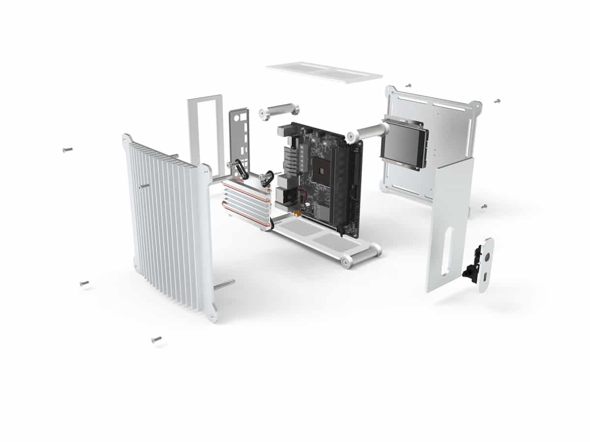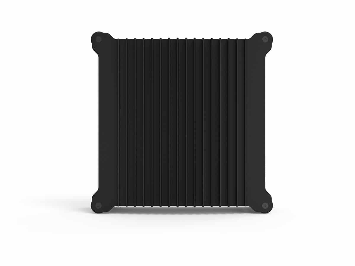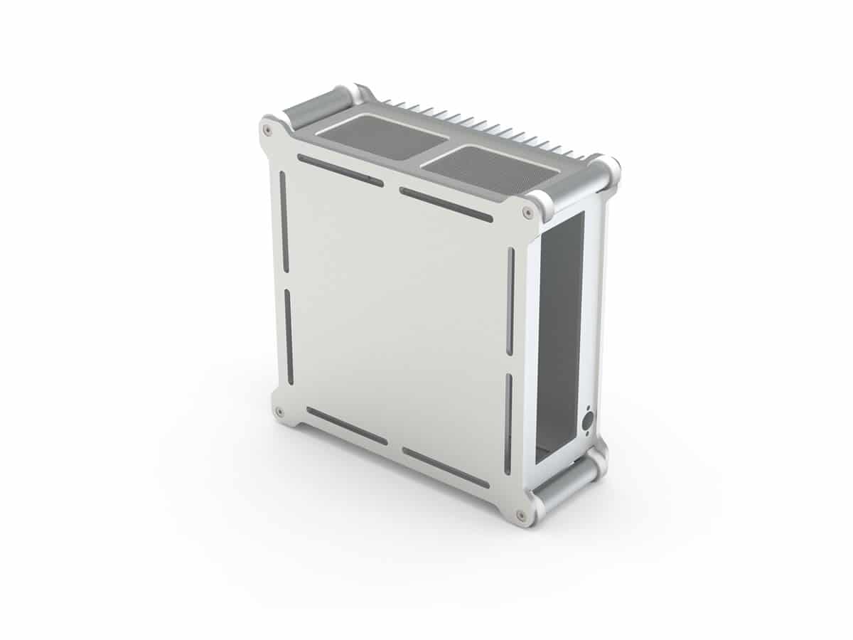 Das neue Streacom DB1 ist gerade für Prozessoren mit integrierter GPU entwickelt worden. Dabei bewältigt es bis zu 45 Watt TDP mit passiver Kühlung. Da das ITX-Gehäuse nicht besonders viel Platz bietet, hat auch keine Grafikkarte Platz im Inneren. Im DB1 kann ein Mainboard im Mini-ITX-Formfaktor eingebaut werden. Dazu noch ein 2,5-Zoll-Laufwerk und je nach Größe des Mainboards noch eine M.2-SSD. Das Streacom-Gehäuse unterstützt Prozessoren mit einer TDP von bis zu 45 Watt, welche vom Gehäuse selbst passiv gekühlt werden. Dafür gibt es im Inneren ein variabel zu befestigendes CPU-Modul mit Kupferplatte und Heatpipes. Mit diesem wird die Abwärme vom Prozessor direkt an die seitlichen Kühlrippen des DB1 abgeführt. Kompatibel ist das Modul dabei mit den aktuellen Desktop-Sockeln. Durch die 4 mm starken Außenseiten aus Aluminium dient das gesamte Gehäuse als Kühler. Dabei sind die Seiten über vier Aluminiumstäbe miteinander verbunden.
