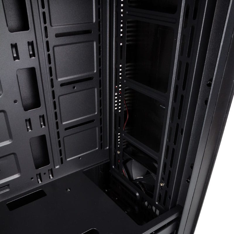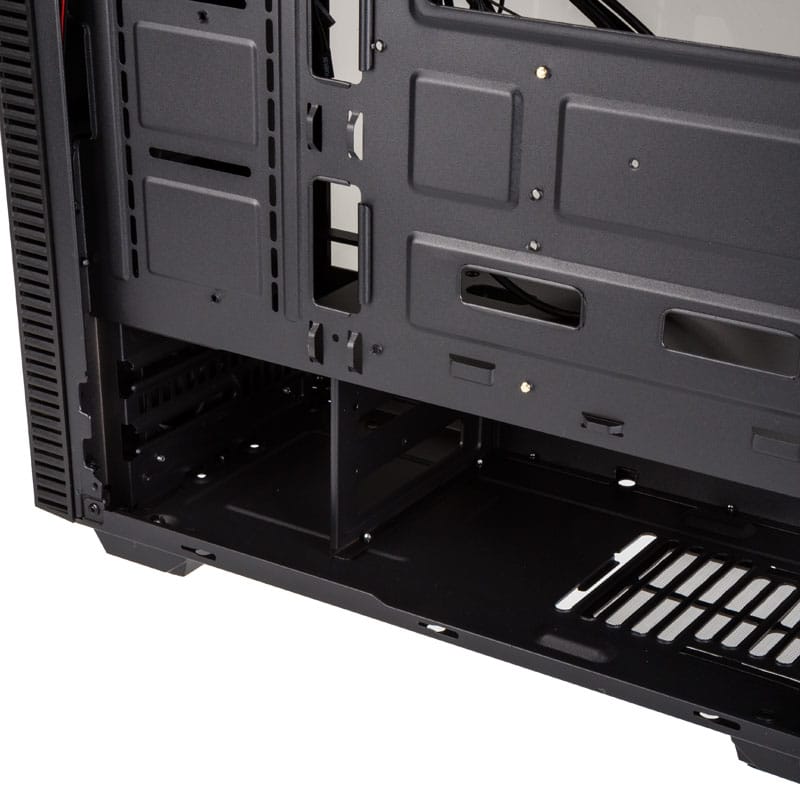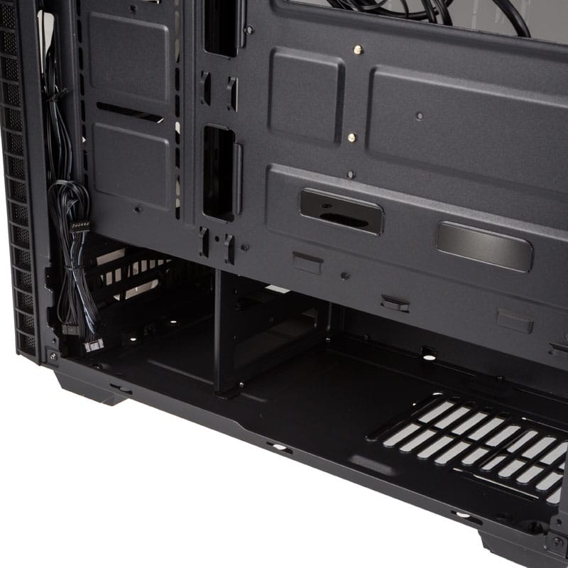 Der Rahmen und das andere Seitenteil ist bei beiden Gehäusen aus Stahl. Die Kabel hinter dem Tray bleiben also verborgen durch das Seitenteil. Für Grafikkarten gibt es bis zu 36 cm Platz und der Prozessorkühler kann bis zu 16 cm hoch sein. Es können keine Lüfter über 120 mm verbaut werden, insgesamt können drei Lüfter an der Front, zwei unter dem Deckel und einer am Heck angebracht werden. Für eine Wasserkühlung mit einem 240-mm-Radiator ist auch Platz. Aktuell ist die Trennung von Mainboard und Laufwerken beziehungsweise Netzteil voll im Trend, der sich auch beim Stronghold und Observatory wiederfindet.
