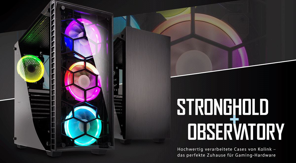 Obwohl beide Gehäuse Seitenteile aus Glas bieten, hält sich der Preis für Midi-Tower voll im Rahmen. Das Kolink Stronghold gibt es bei Caseking für € 70,86 *. Das mit den RGB-Lüftern ausgestattete Kolink Observatory bietet zusätzlich noch eine Glasfront und ist für € 72,84 * zu haben. Beide Gehäuse werden voraussichtlich Mitte März lieferbar sein.