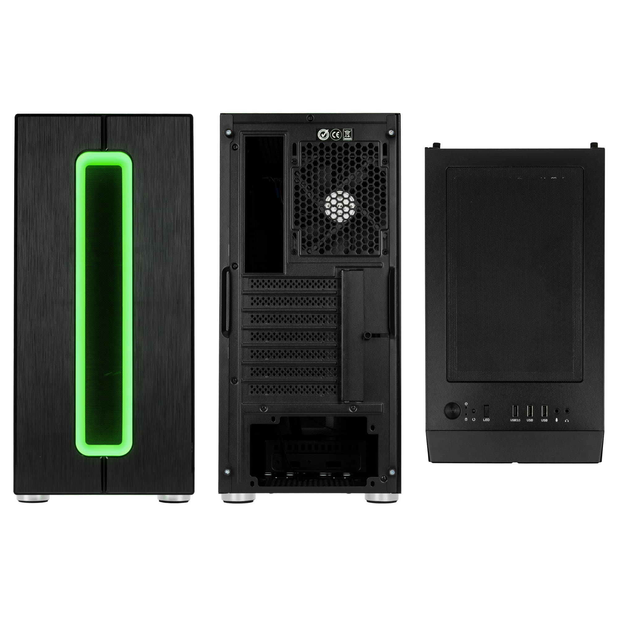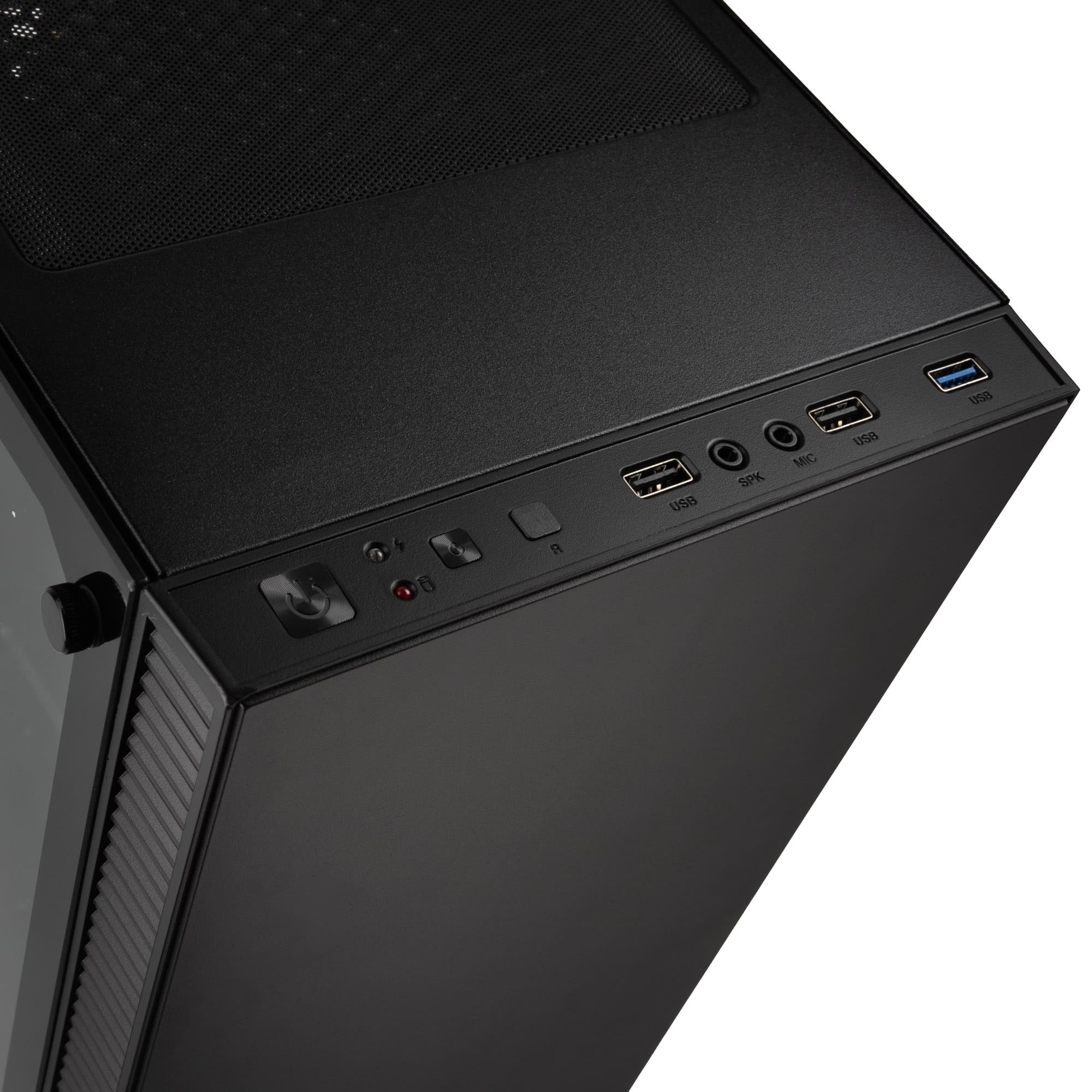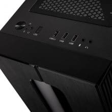Das I/O-Panel besteht aus einem Ein-/Ausschalter, einer Steuerungstaste für die RGB-Beleuchtung, Reset-Taste, Power-LED, HDD-LED, 1x USB 3.0, 2x USB 2.0, sowie Mikrofon- und Klinkenanschluss.