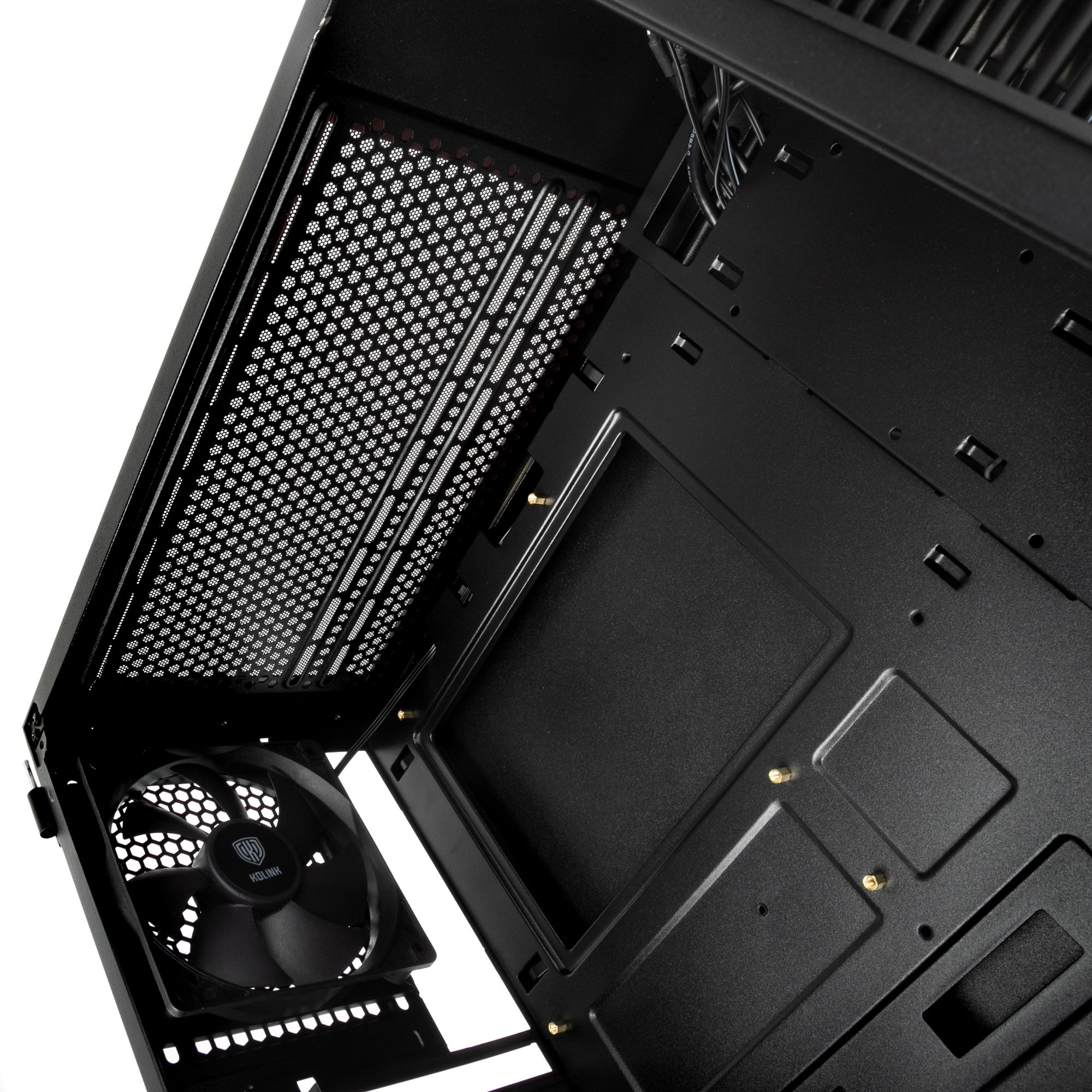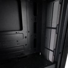 Im Inneren bietet das Castle etwas mehr Platz für Grafikkarten, als das Nimbus, nämlich 350 mm. Auch hier lassen sich Mainboards im Formfaktor Mini-ITX, mATX und ATX einbauen. CPU-Kühler haben hier ebenfalls Platz für eine Größe von 160 mm. Anstatt einem, bringt das Castle gleich zwei vorinstallierte 120 mm Lüfter mit und es können bis zu vier weitere Lüfter hinzugefügt werden. Magnetische Staubfilter gibt es auf der Unterseite und im Deckel. Auch hier findet sich eine Netzteilabdeckung sowie jeweils einen Radiator-Mount in der Front und im Deckel für Radiatoren bis zu 240 mm.