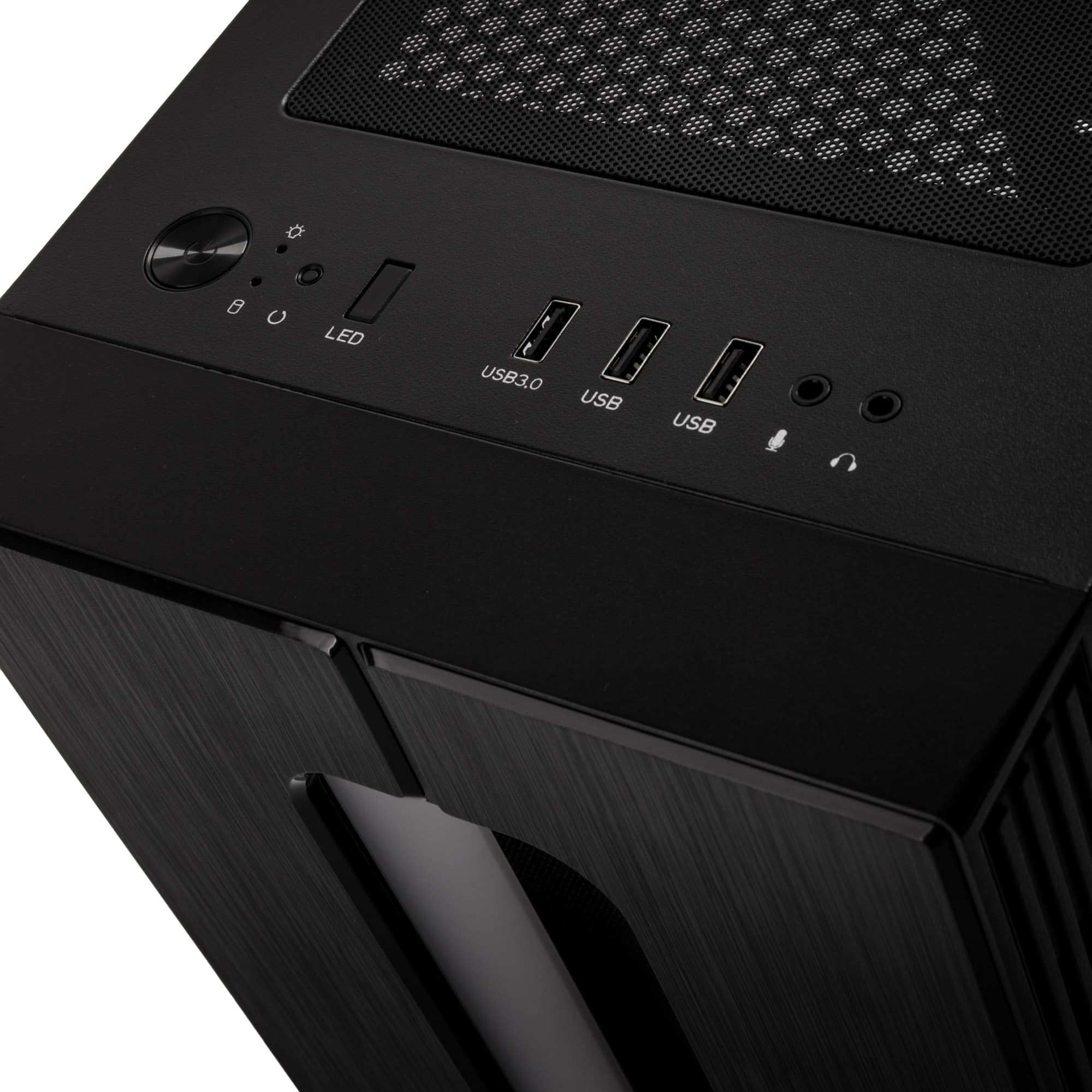 Das I/O-Panel besteht ebenfalls aus einem Ein-/Ausschalter, Power-LED, HDD-LED, 3,5 mm Anschlüsse für Mikrofon und Audio, Reset-Taste, 2x USB 2.0 und 1x USB 3.0.