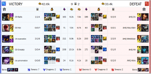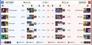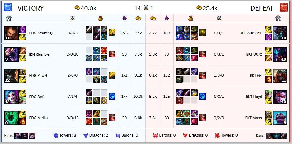 Bereits zu Anfang, in den ersten 4 Minuten, konnte Edward Gaming bereits 3 Kills auf der Bot-Lane für sich holen. Mittels ihres dadurch gefeedeten Ad-Carry „Deft“ hat Edward Gaming das komplette restliche Spiel dominiert. Zusätzlich konnte Edward Gaming noch viele Objectives für sich entscheiden. Unter anderem konnte Edward Gaming 2 Dragons für sich entscheiden und 2 Inhibitoren in gerade mal 19 Minuten zerstören. Leider reichte es für Edward Gaming nicht für das perfekte Spiel, weil Ihr Ad-Carry „Deft“ einmal getötet worden ist. Somit konnte Edward Gaming das Spiel in Minute 20 für sich entscheiden, da Bangkok Titans das Spiel aufgab.