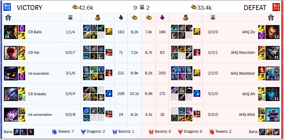 In diesem Spiel konnte ahq e-Sports Club das Early Game durch das First Blood für sich entscheiden. Doch danach konnte Cloud9 das Spiel mittels eines Towers und eines Dragons wieder herrumreißen. Danach war das Spiel bis Minute 16 durch Objectives auf beiden Seiten sehr ausgeglichen. Doch Cloud9 konnte durch einen gewonnen Teamfight 2 Kills holen und dadurch den Baron-Buff für sich holen und damit das restliche Spiel dominieren. Denn Cloud9 setzte zu einem aggressiven Push auf der Mid-Lane an und konnte so das Spiel für sich entscheiden.