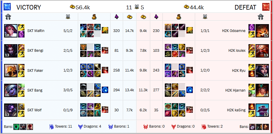 Zu Anfang war das Spiel sehr ausgeglichen, da beide Teams einzelne Kills erzielen konnten. Zu Beginn des Mid-Games konnte SKTelecom T1 sich den Dragon sichern, währenddessen verloren sie allerdings einen Tower. Dadurch konnte sich H2K einen leichten Vorteil sichern, welchen sie bis zu Minute 16 halten konnten. Ab diesem Punkt ging die Mehrzahl der Objectives an SKTelecom T1, wodurch sie das späte Mid- und End-Game dominieren konnten. Dabei hat sich SKTelecom T1 den Baron-Buff geholt und konnte mehrere Objectives ergattern, sowie 2 Inhibitoren zerstören. Nach 31 Minuten war das Spiel vorbei und SKTelecom T1 hat dadurch das Spiel für sich entscheiden können.
