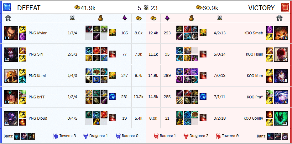 Das Spiel begann bereits sehr spannend mit einem Teamfight von 3 Kills, 2 davon gingen an paiN Gaming. Bereits im Early-Game konnten beide Teams 2 Towers des gegnerischen Teams zerstören und jeweils noch einen Kill erzielen. KOO Tigers konnte den ersten Dragon für sich holen. Allerdings glichen sich die vielen Aktionen aus und das Spiel blieb vorerst unentschieden. Nach einigen weiteren Fights in denen KOO Tigers noch einige Kills erziete und einen Tower von paiN Gaming zerstören konnte, gingen die KOO Tigers so langsam in Führung. Zwar konnte sich paiN Gaming noch einen Dragon sichern und einen gegnerischen Tower zerstören, dennoch konnten sie das Spiel nicht herumreißen. Dank ihren 23 Kills und weiteren Objectives konnten KOO Tigers das Spiel für sich entscheiden.