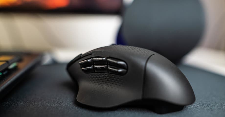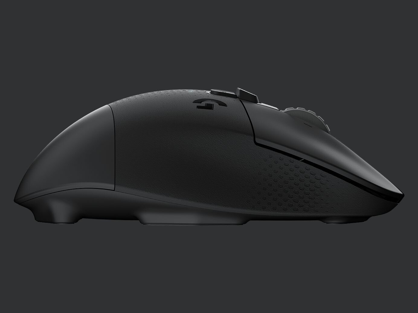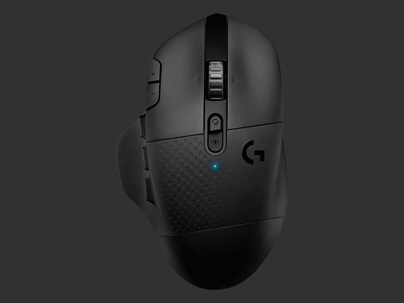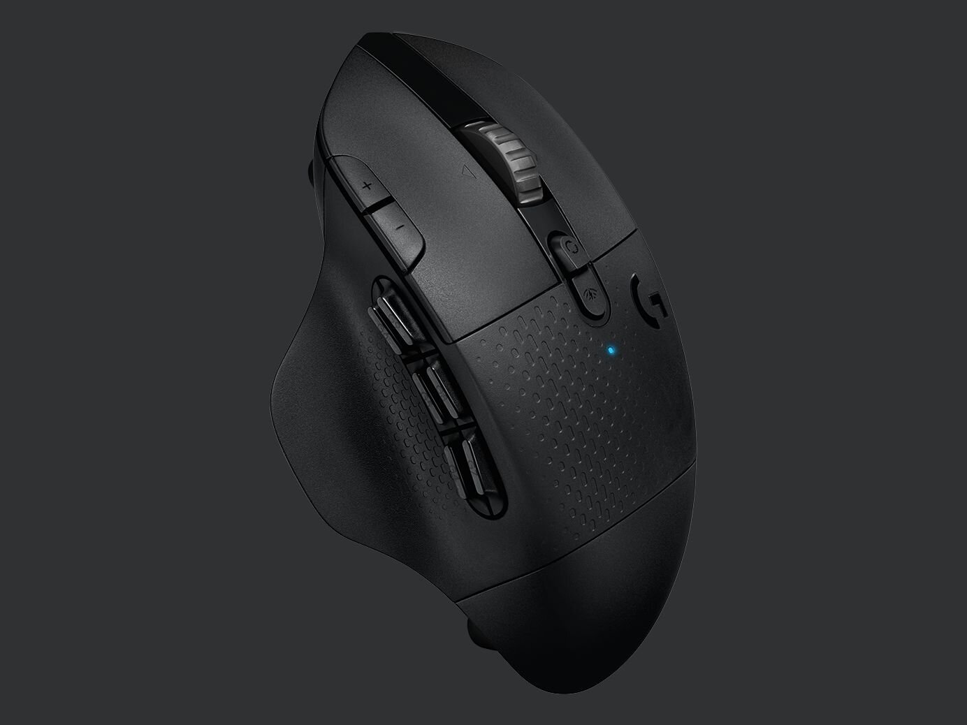 Insgesamt verfügt die G604 Lightspeed über fünfzehn frei programmierbare Tasten. Neben den zwei Primärtasten gehört dazu auch das 4-Wege-Mausrad, das Logitech als fünf Tasten zählt. Bekannt ist das mechanische gerasterte Mausrad bereits aus der Anfang 2019 vorgestellten Logitech G502 Hero Lightspeed. Auch die Schalter zum Wechseln zwischen den einzelnen Modi des Mausrads und die beiden in der linken Maustaste integrierten Zusatztasten hat Logitech aus der G502 übernommen. Die verbleibenden sechs Tasten hat Logitech auf der linken Seite oberhalb der Daumenablage verbaut.