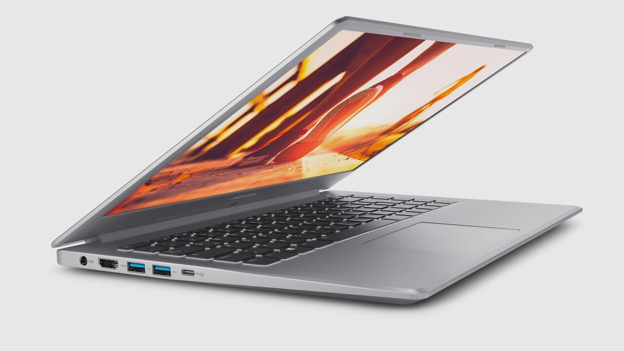 Außerdem offenbart das Notebook nach dem Aufklappen einen sehr schmalen Rahmen. So sorgt Medion insgesamt für einen hübschen ersten Eindruck. Beim Display setzt Medion auf IPS-Technologie und eine Auflösung von 1920 x 1080 Pixeln. Damit dürfte das Notebook ausreichend scharf für den durchschnittlichen Nutzer sein.