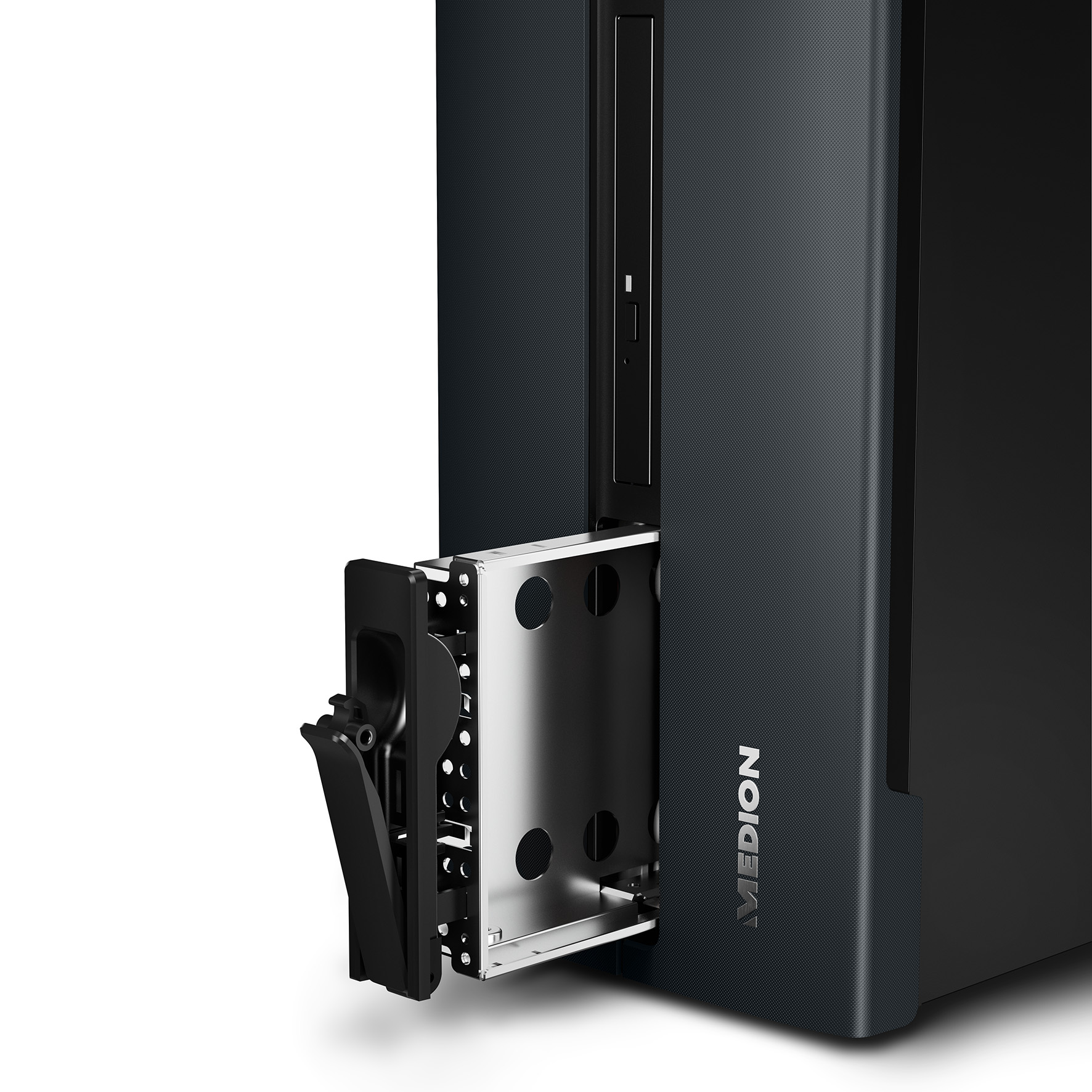 Das Gerät ist mit einem i3-8100 mit bis zu 3,6 GHz von Intel, einer SSD von 128 GB, acht GB Arbeitsspeicher und einer 2.000 GB fassenden Festplatte ausgestattet. Über den integrierten Wechselrahmen lässt sich problemlos eine zusätzliche Festplatte einbauen – reicht der Speicher irgendwann nicht mehr, stellt dies also keinen Grund dar, gleich zu einem neuen PC zu greifen.