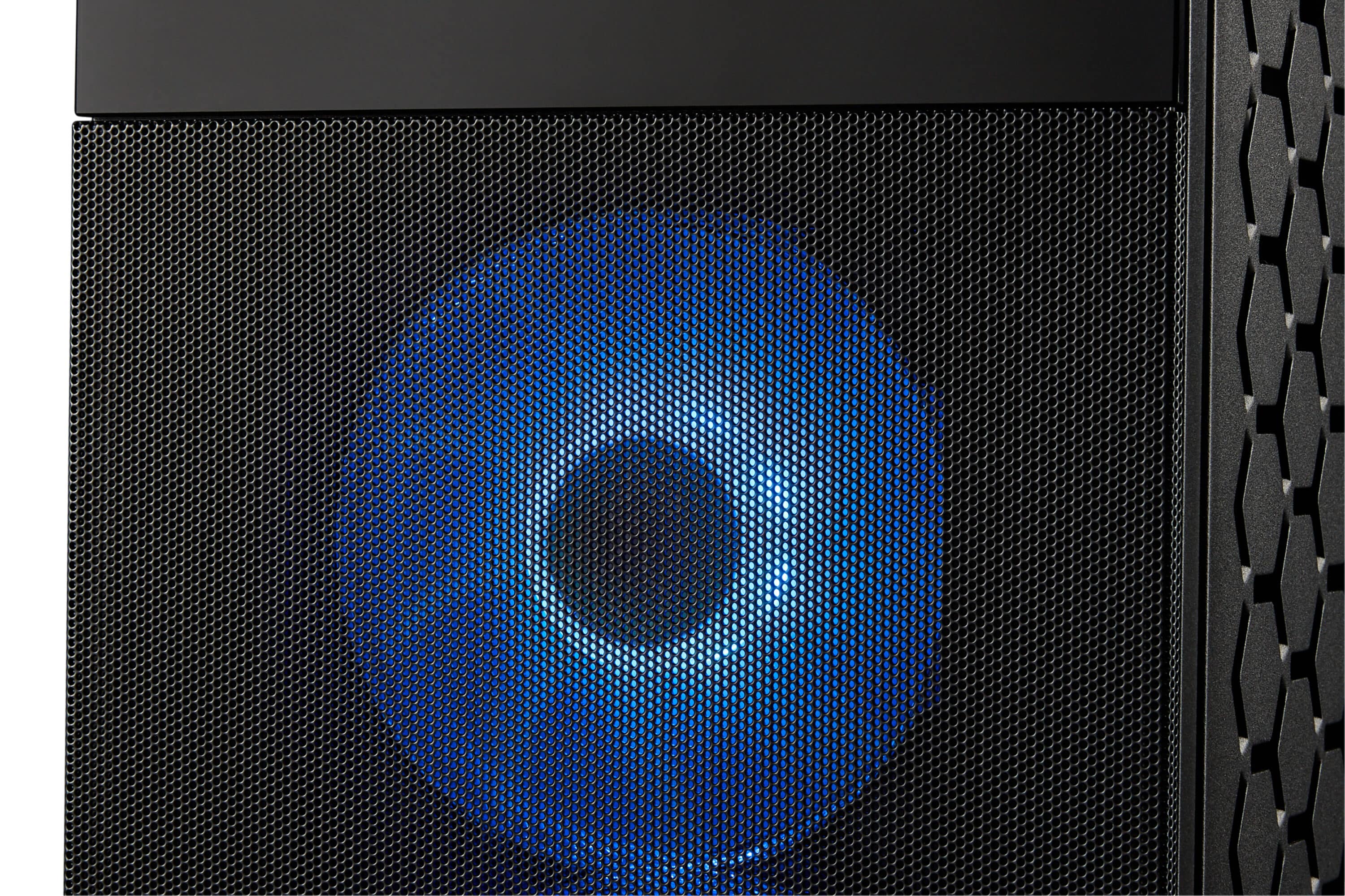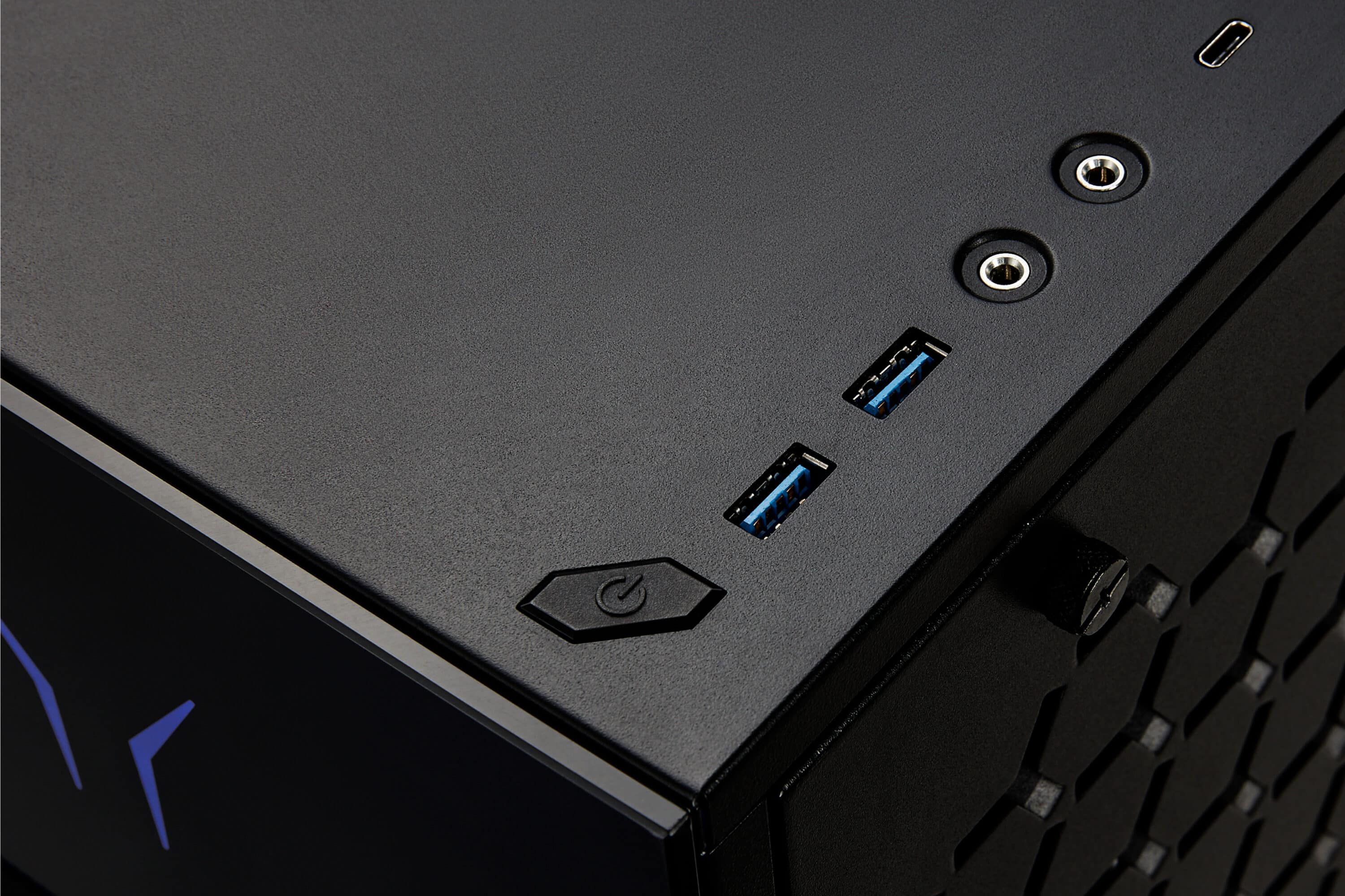 An der Front des rund 12 kg schweren Gaming-PCs findest du je einmal USB 3.2 Gen 2 Type-C und USB 3.2 Gen 1 Type-A, einen Mic in- und einen Audio out-Anschluss. Als Betriebssystem ist Windows 11 Home bereits vorinstalliert.