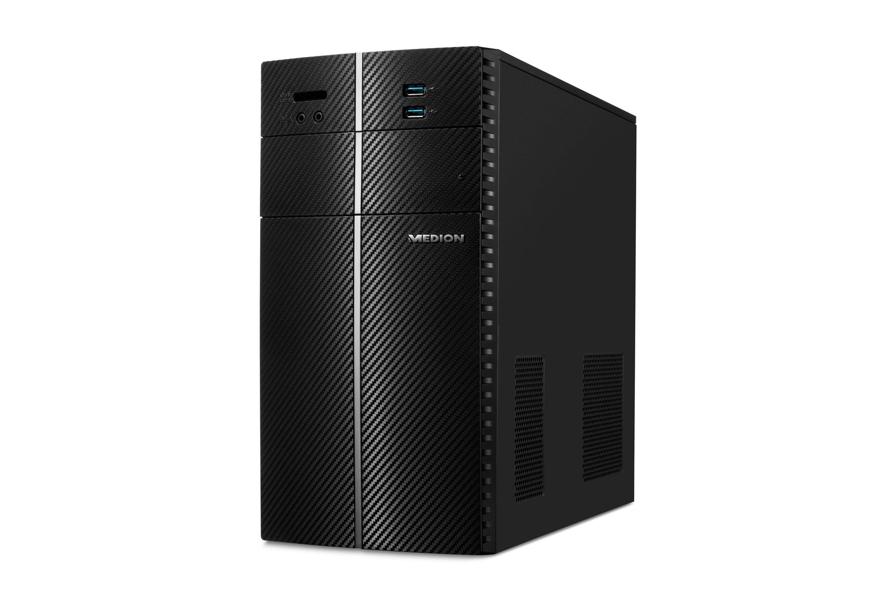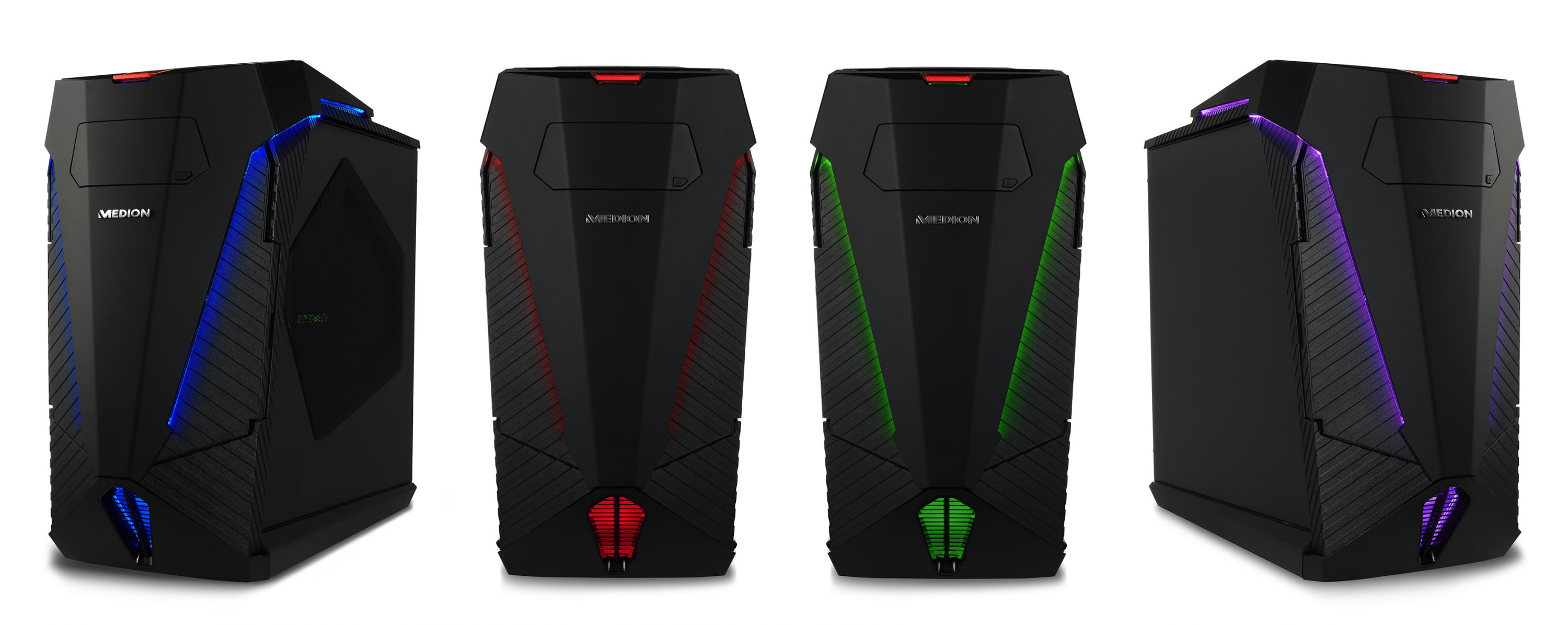 Der “Erazer P66001“ setzt ebenfalls einen Intel Core i5-8400 ein. Als Grafikkarte kommt eine Nvidia GeForce GTX 1050 Ti mit 4 GB GDDR5 als Grafikspeicher zum Einsatz. Eine 256 GB große PCIe-SSD sorgt für extrem schnelle Startzeiten aller Programme. 8 GB DDR4-Arbeitsspeicher komplettieren die Ausstattung. Das mattschwarze Micro-ATX-Gehäuse wird von blauen LED-Elementen an der Front verschönert. Hierbei handelt es sich eindeutig um ein Mittelklassesystem, das auch durchaus aktuelle Spiele in Full HD-Auflösung befeuern kann.