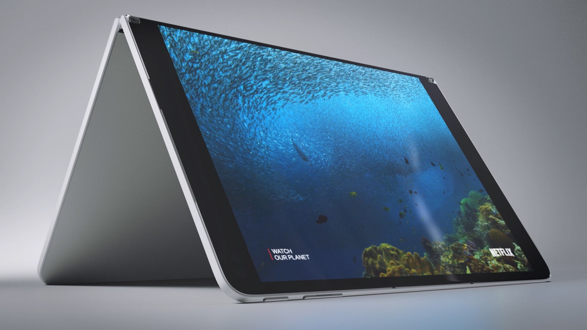 Das große Surface Neo verfügt über zwei in der Diagonale je neun Zoll messende Displays, die mit Gorilla Glas geschützt werden. So sollen sie sich als resistent gegenüber Beschädigungen erweisen – eine Eigenschaft, die bei Dual-Display-Geräten bisher nur schwerlich erreicht wurde. Die beiden Hälften des Geräts sind mit zwei ganz außen angebrachte 360-Grad-Scharnieren verbunden – so soll die Naht in der Mitte möglichst nicht direkt ins Auge stechen. Werden zwei Anwendungen parallel genutzt, dient die Abtrennung in der Mitte hingegen als auffällige Trennlinie zwischen ebendiesen Anwendungen.