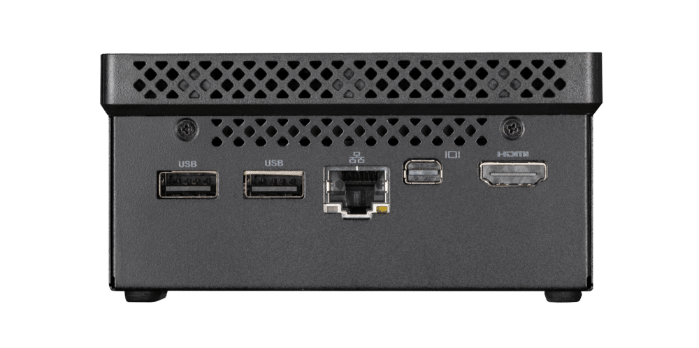Bei den Gigabyte Brix kann die Bildausgabe über zwei Display-Ausgänge, entweder via Mini-DisplayPort 1.4b oder mittels HDMI 2.0b erfolgen. Diese sind beide für maximal 2160p60 spezifiziert. Zusätzlich verfügen die Mini-PCs über vier USB Typ C-Ports an der Front, welche USB 3.0 mit einer Durchflussrate von 5 Gbit/s bieten. An der Rückseite des Gehäuses befindet sich dazu ein Gigabit-LAN-Anschluss (Realtek 8111HS). Ansonsten kann via WLAN-Modul mit Wi-Fi 5 (WLAN 80.2.11ac) und auch mit Bluetooth 4.2 gefunkt werden.