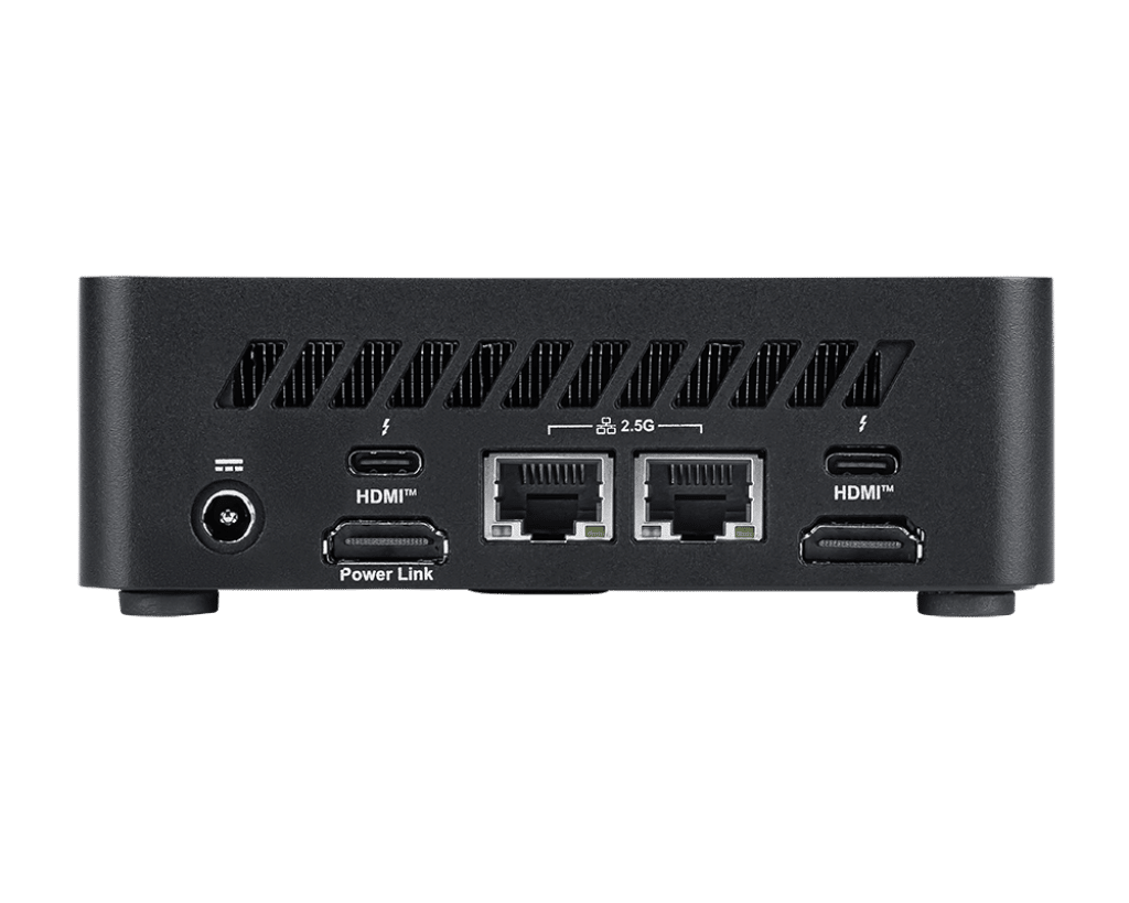 Ein weiteres praktisches Detail: Über die Funktion MSI Power Link kann der Mini-PC direkt über kompatible MSI-Monitore eingeschaltet werden. Das ist besonders nützlich bei einer VESA-Montage, bei der das Gerät platzsparend auf der Rückseite eines Monitors befestigt wird.