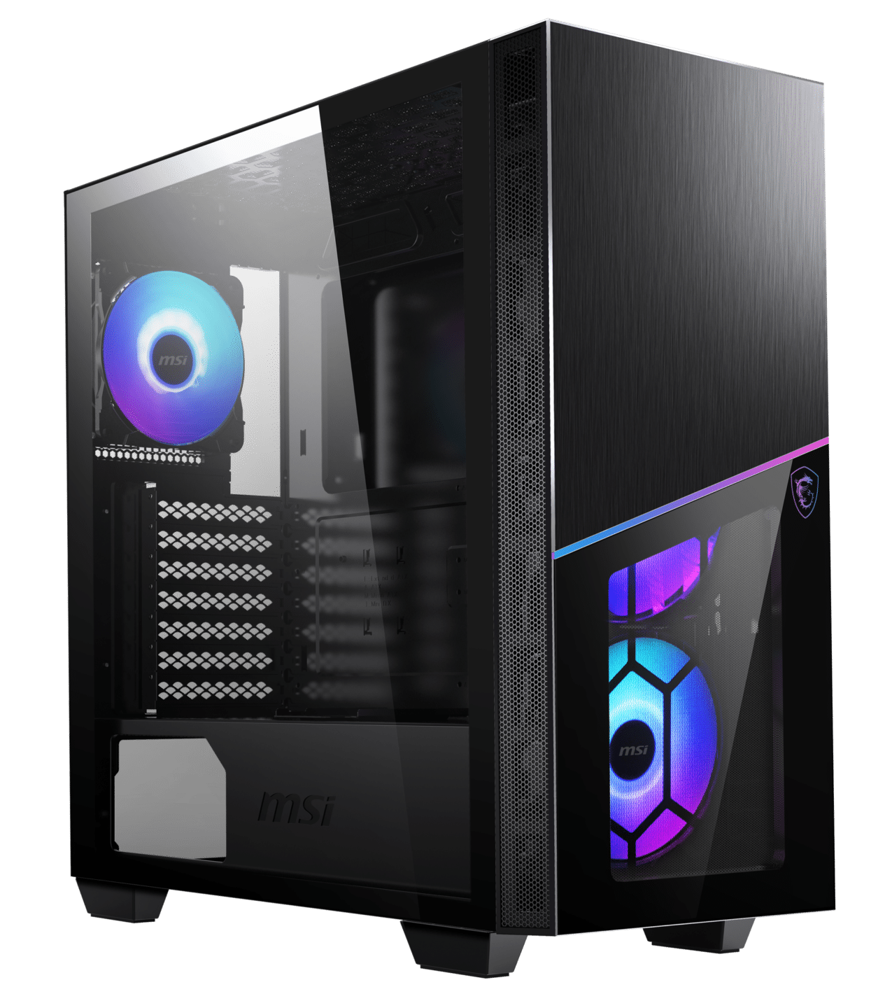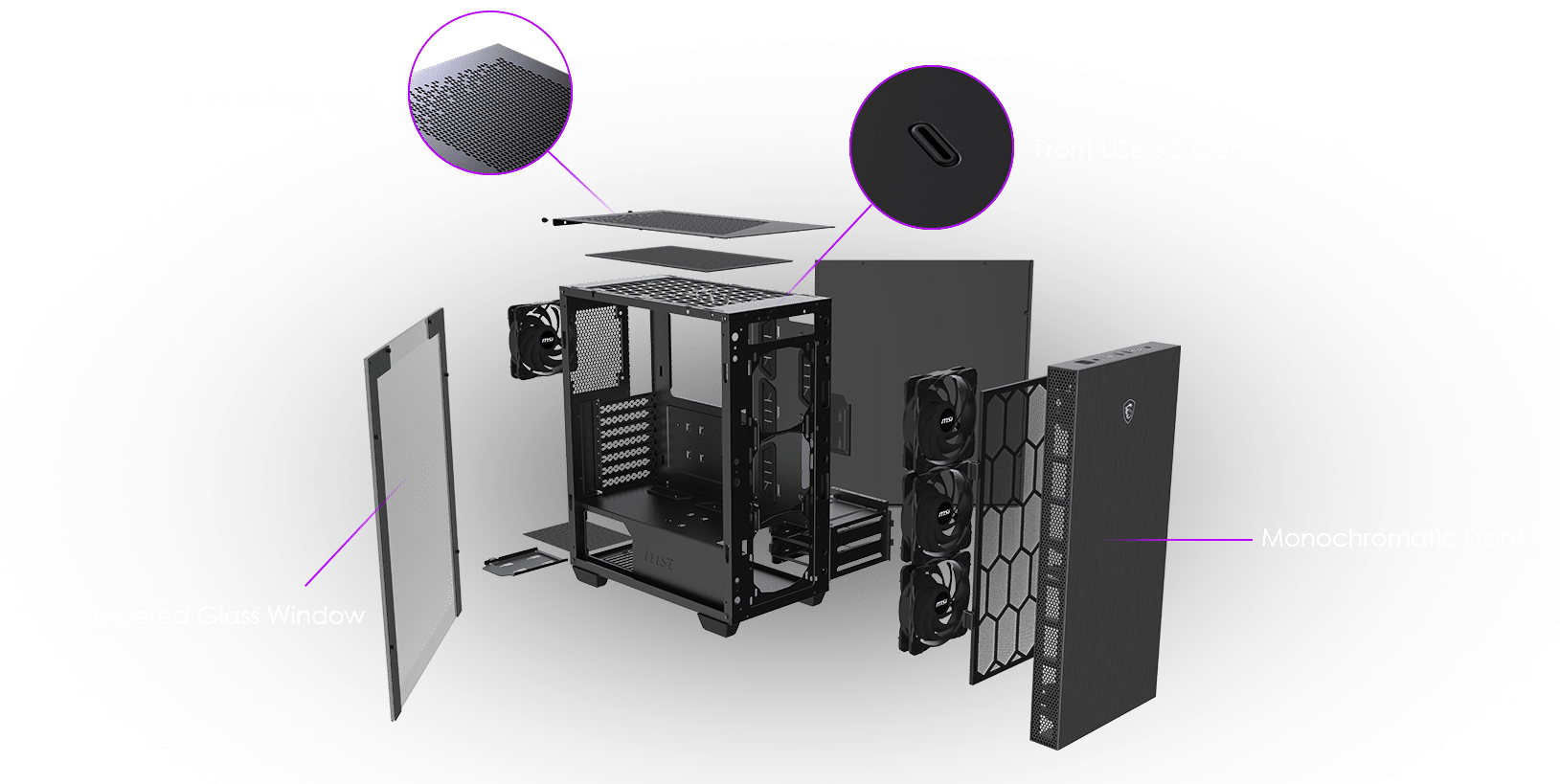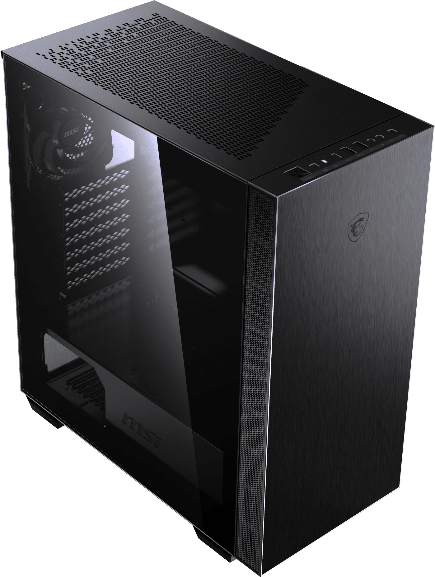 mit der getönten Frontplatte aus Glas kommt die ARGB-Beleuchtung ordentlich zum Vorschein. Seitlich des Gehäuses befindet sich ein Fenster aus 4 mm gehärtetem Glas, um auch hier Einblicke in das Innere zu erhalten. Dabei ist das Glasfenster ohne Schrauben angebracht, somit lässt es sich durch den Schließmechanismus einfach öffnen und wieder schließen. Die Oberseite des MPG-Gehäuses hat ein zusätzliches Airflow System, mit einen magnetischen Staubfilter zur leichten Reinigung. Damit wird für einen verbesserten Luftstrom gesorgt, um die Komponenten vor Überhitzung zu schützen. Für eine noch bessere Kühlung sorgen die ab Werk mitgelieferten vier Lüfter. Um einen nahezu perfekten Air Flow zu bekommen, können insgesamt bis zu sechs Gehäuselüfter installiert werden.