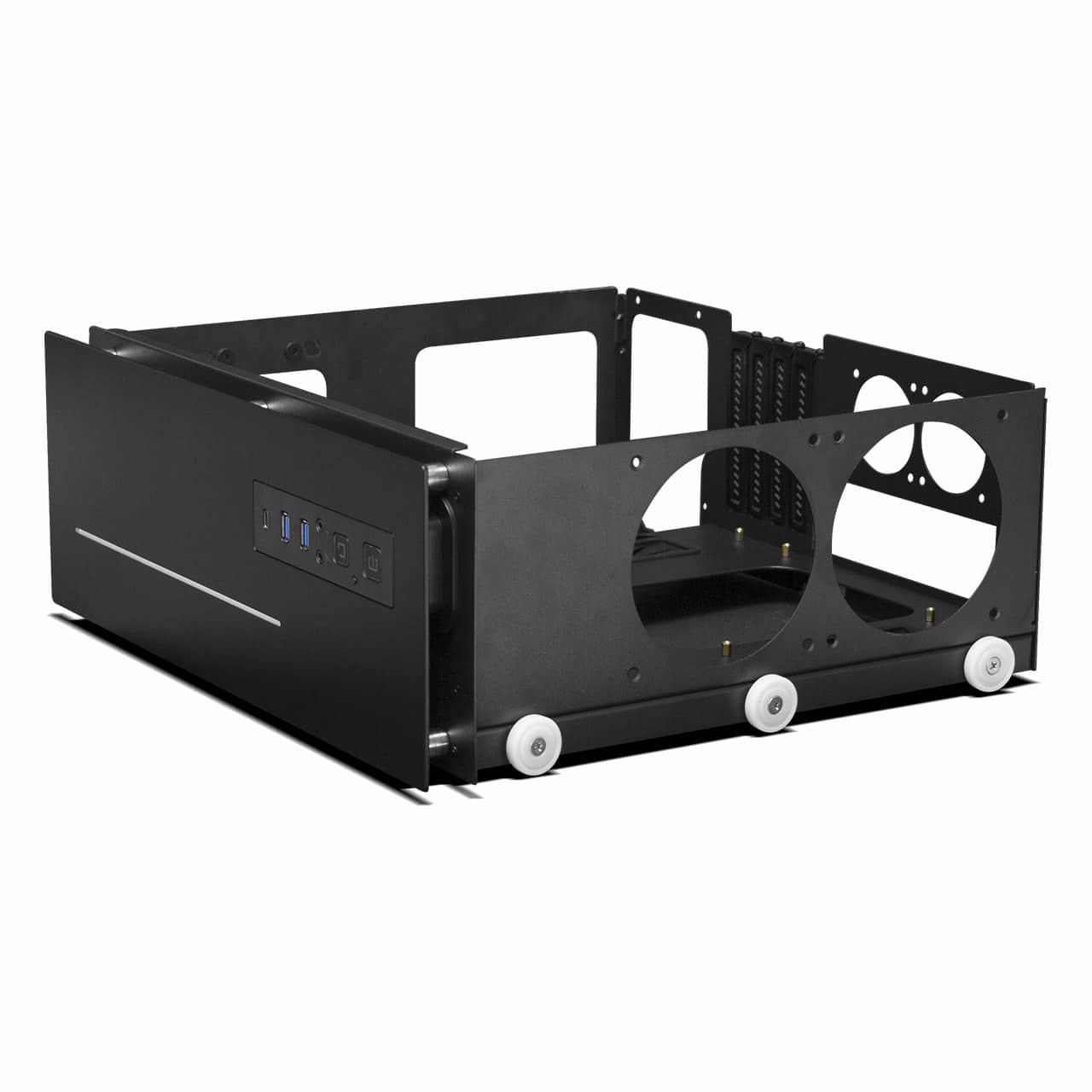 Das Project S Mini bietet zudem Platz für zwei 2,5 Zoll große Laufwerke, ein 3,5-Zoll-Laufwerk und bis zu drei 60-mm-Gehäuselüfter. Das 11,9 x 50,2 x 30,9 Zentimeter große Gehäuse verfügt darüber hinaus über eine LED-Beleuchtung, zweimal USB 3.0 und einmal USB 3.1 Typ C. Eine Grafikkarte wird per Riser-Karte installiert. Lüfterlöcher vermeiden einen Hitzestau.