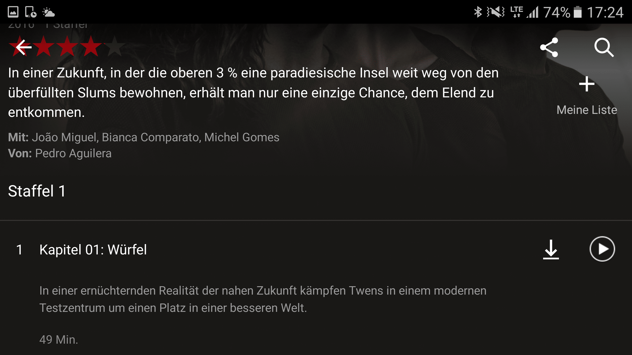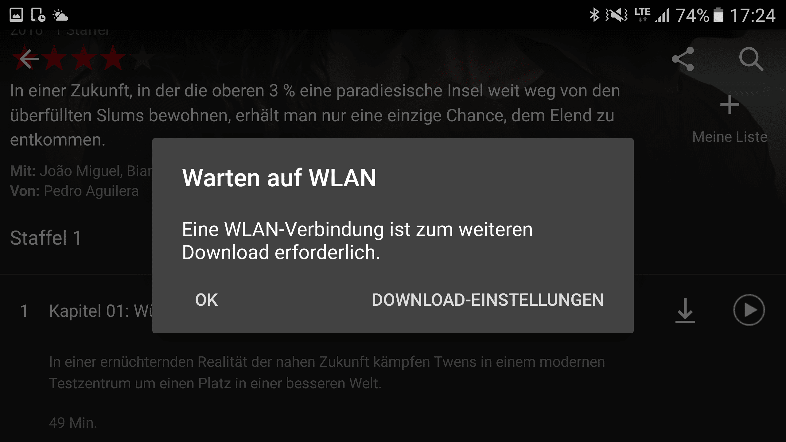 Bei der Serie, die ich probeweise heruntergeladen habe, sind für 49 Minuten 206 MB Speicher verbraucht worden. Man kann also durchaus einige Filme auf sein Smartphone oder Tablet speichern.
