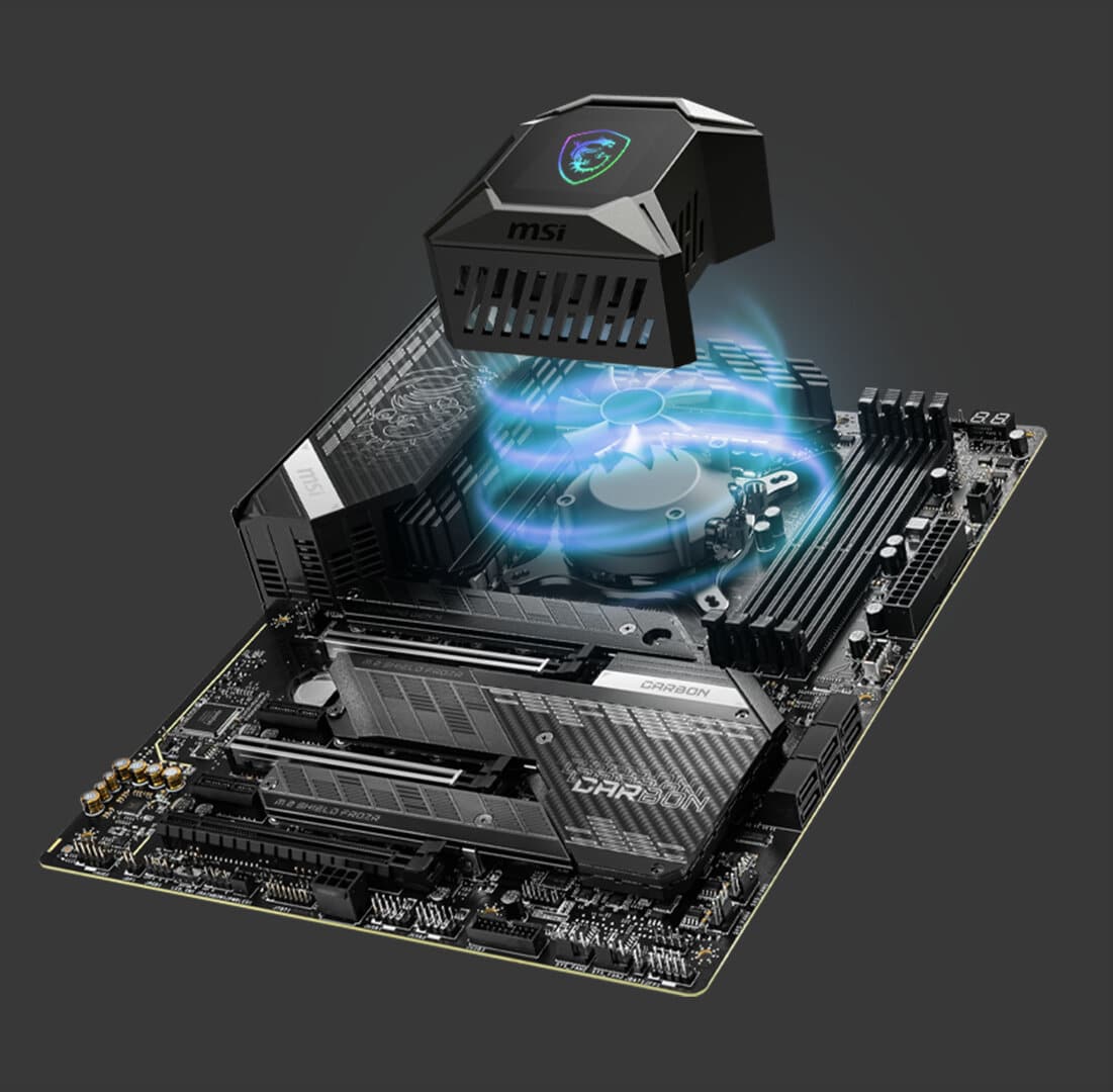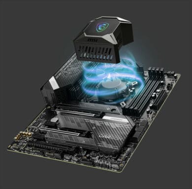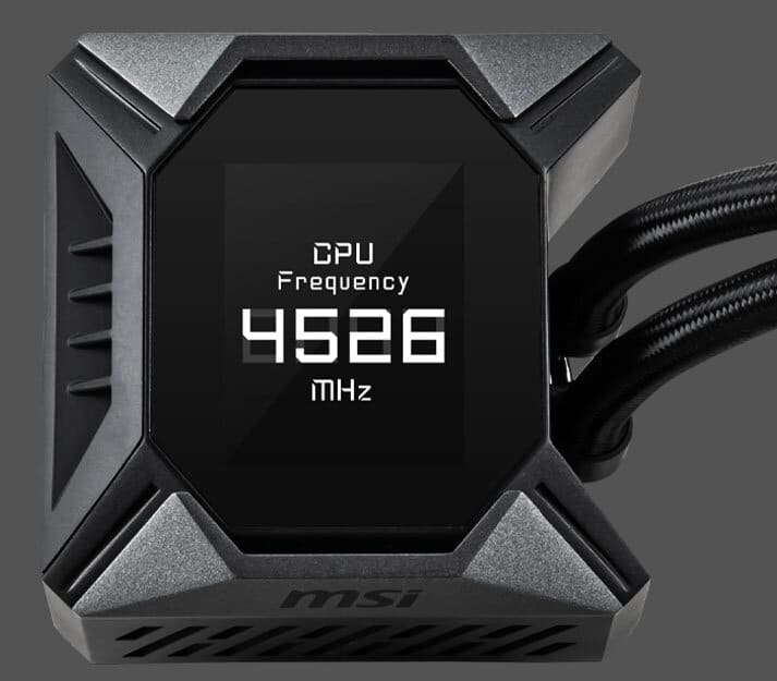 Dazu hat MSI seinen Coreliquid-AiO-Wasserkühlungen auch einen eigenen Touch verpasst. Die Pumpeneinheit der MSI K-Serie mit einem Durchmesser von 60 mm hat einen Lüfter im Pumpengehäuse, bei welchen die Drehzahl angepasst werden kann. Weiterhin sind Öffnungen für Luftzirkulation zur besseren Kühlung des CPU-Sockels vorhanden. Durch die Kombinationen von Öffnungen und Lüfter wird auch der Spannungswandler mit gekühlt.