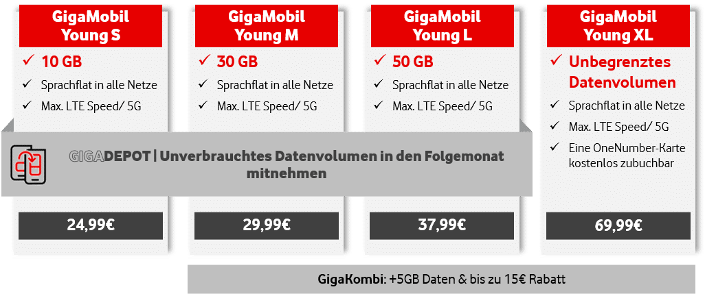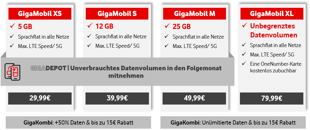 Wer ein Festnetz- oder TV-Produkt von Vodafone hinzubucht, profitiert zudem vom sogenannten GigaKombi-Vorteil. Hier lassen sich im Verbund bis zu 15 Euro pro Monat bei der Mobilfunk-Rechnung sparen. Im Verbund steht ab dem Tarif GigaMobil M dann sogar ein unbegrenztes Datenvolumen zur Verfügung, während sich das monatliche Volumen in den Modellen XS und S um 50 Prozent erhöht.