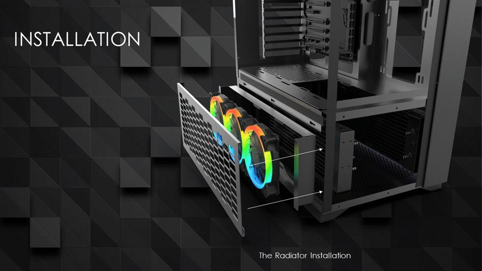 Die Besonderheit des Raijintek Paean Premium ist die Unterbringungsmöglichkeit für Radiatoren im Bodenteil, anstatt eines Netzteils. Es können zwei 360-mm-Radiatoren mit einer Dicke von 28 mm im Bodenteil des Gehäuses aufgenommen werden. Das Bodenteil ist vom restlichen Innenraum zum Größtenteil thermisch abgekoppelt, weil der Luftstrom in dieser Ebene seitlich durchgeführt wird. Ein zusätzlicher Radiator mit einer solchen Größe kann dann unter dem Deckel oder neben dem Mainboard platziert werden. Um eine Kollision mit einer eventuell langen Grafikkarte zu vermeiden wird sie versetzt zum Mainboard angebracht.