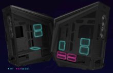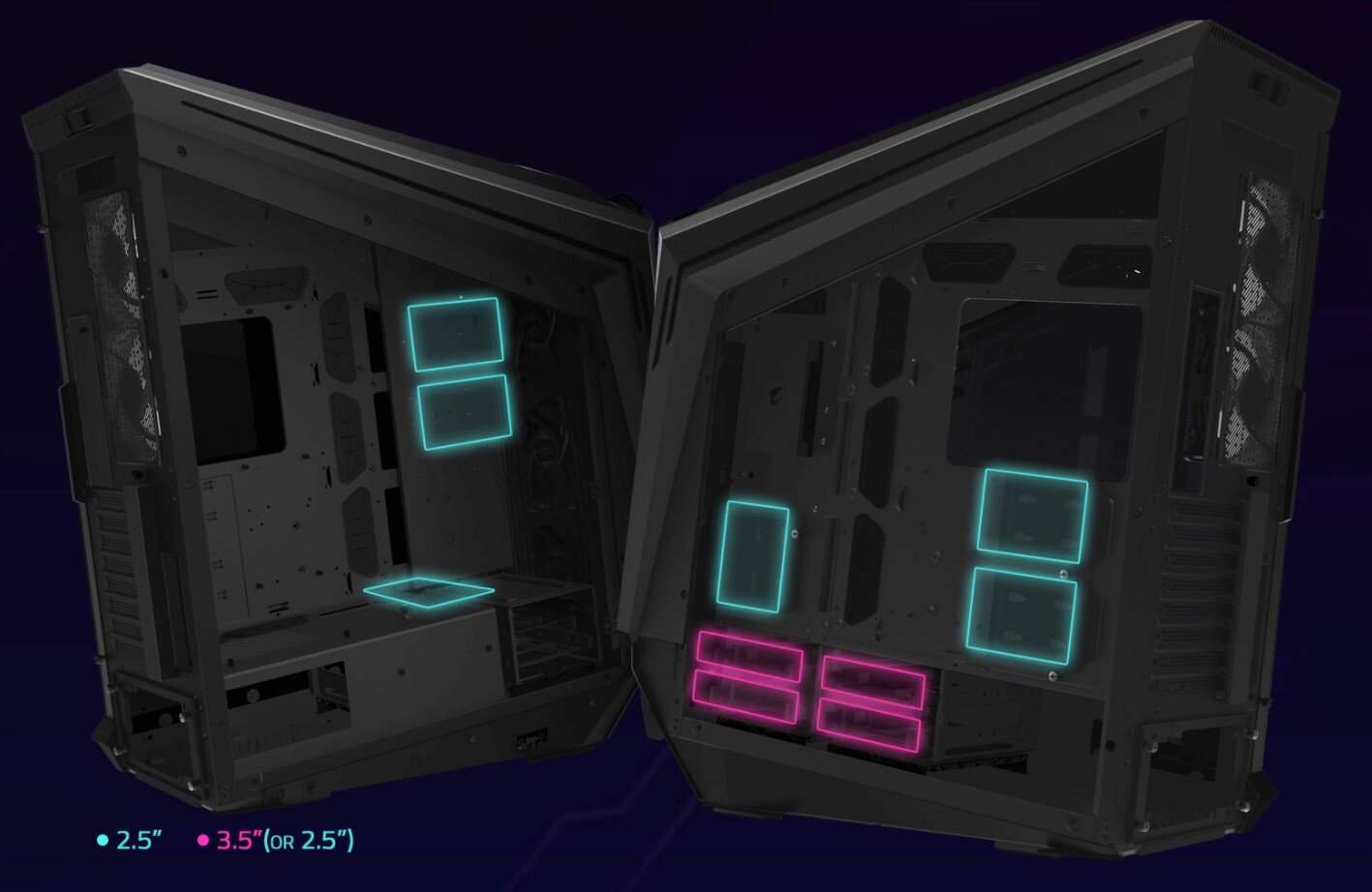 Dazu können zwei Slot breite Grafikkarten vertikal befestigt werden, die GPU darf dabei 490 mm haben. Auch der CPU-Kühler finden mit 198 mm genügend Platz in dem 144-Liter-Gehäuse von Gigabyte. Damit einem der Speicherplatz nicht ausgeht, können entweder sechs 2,5 Zoll oder vier 3,5 Zoll große Einschübe für den Speicher genutzt werden. Die Einschübe verteilen sich im Aorus C700 auf zwei Käfige. Dabei sind vier von den 2,5-Zoll-Trays unten im Gehäuse.