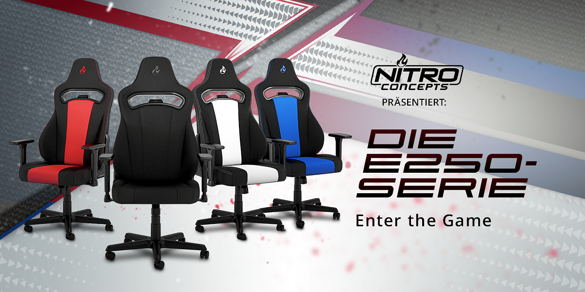 Die neue E250-Serie von Nitro Concepts ist ab jetzt im Handel erhältlich. So kann man die Stühle derzeit bei Caseking zu einem Preis von knapp 180 Euro kaufen.