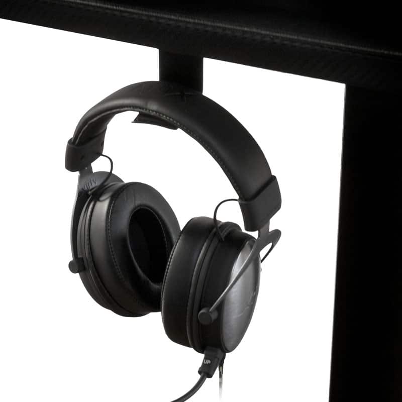 Die beschichte Tischplatte besteht im Kern aus MDF und kann bis zu 50 cm in der Höhe verstellt werden. Die Tischbeine sind aus Stahl gefertigt. Der Gaming Tisch hat als besondere Ausstattung eine stylische Matte mit mikrogewebter Oberfläche zu bieten, die für alle Maustypen geeignet ist. Für Gamer ist außerdem eine Headset-Halterung inklusive.