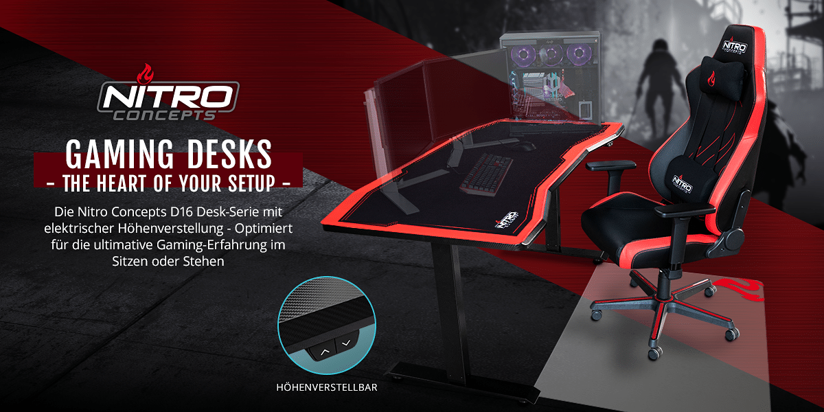 Nitro Concepts, besonders bekannt für seine S300 Gaming-Stühle, verkauft nun Gaming-Tische. Die D16-Serie ist 160×80 cm groß und wahlweise in schwarz (Carbon Black) oder schwarz/rot (Carbon Red) erhältlich.