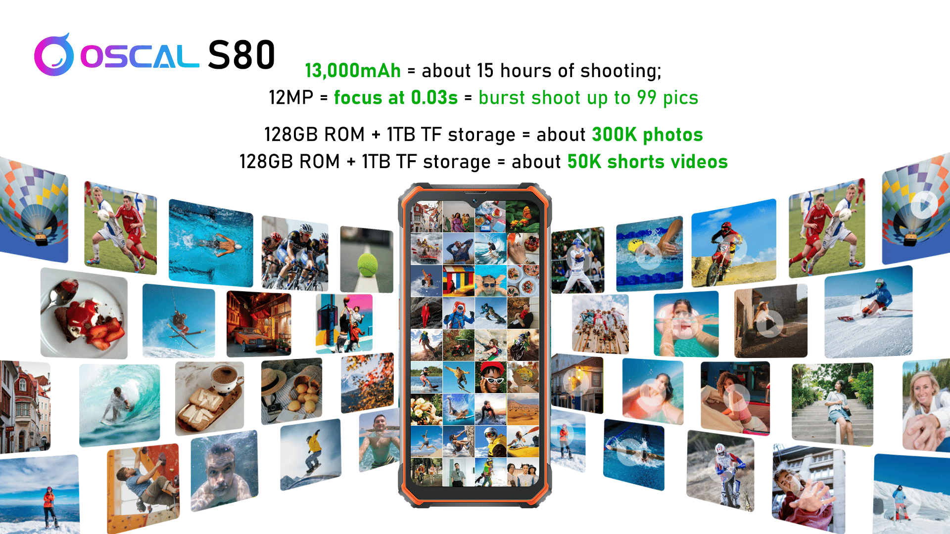 Ein echtes Ausstattungs-Highlight des Oscal S80 ist der Akku. Dieser bietet eine Kapazität von unglaublichen 13.000 mAh, dreimal so viel, wie bei gewöhnlichen Smartphones. Das ist genug Power für 15 Stunden Gameplay moderner Mobile-Games, 20 Stunden Livestreaming und 70 Stunden Musikhören, womit jede Reise zu einem Genuss wird. Die Standby-Zeit liegt bei beeindruckenden 1.152 Stunden.