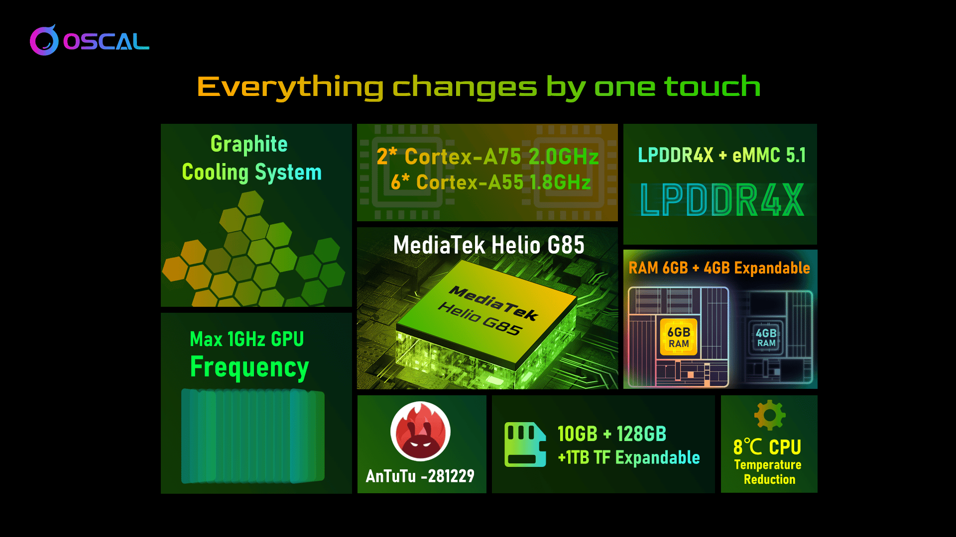 Dabei setzt das Outdoor-Smartphone Oscal S80 auf einen schnellen MediaTek Helio G85 Prozessor, dem 6 GB Arbeitsspeicher und 4 GB virtueller RAM zur Verfügung stehen, um stets für ein schnelles Arbeitstempo zu sorgen. 128 GB interner Speicher bieten Platz für Fotos und Musik, wobei dieser per microSD-Karte um bis zu 1 TB erweitert werden kann.